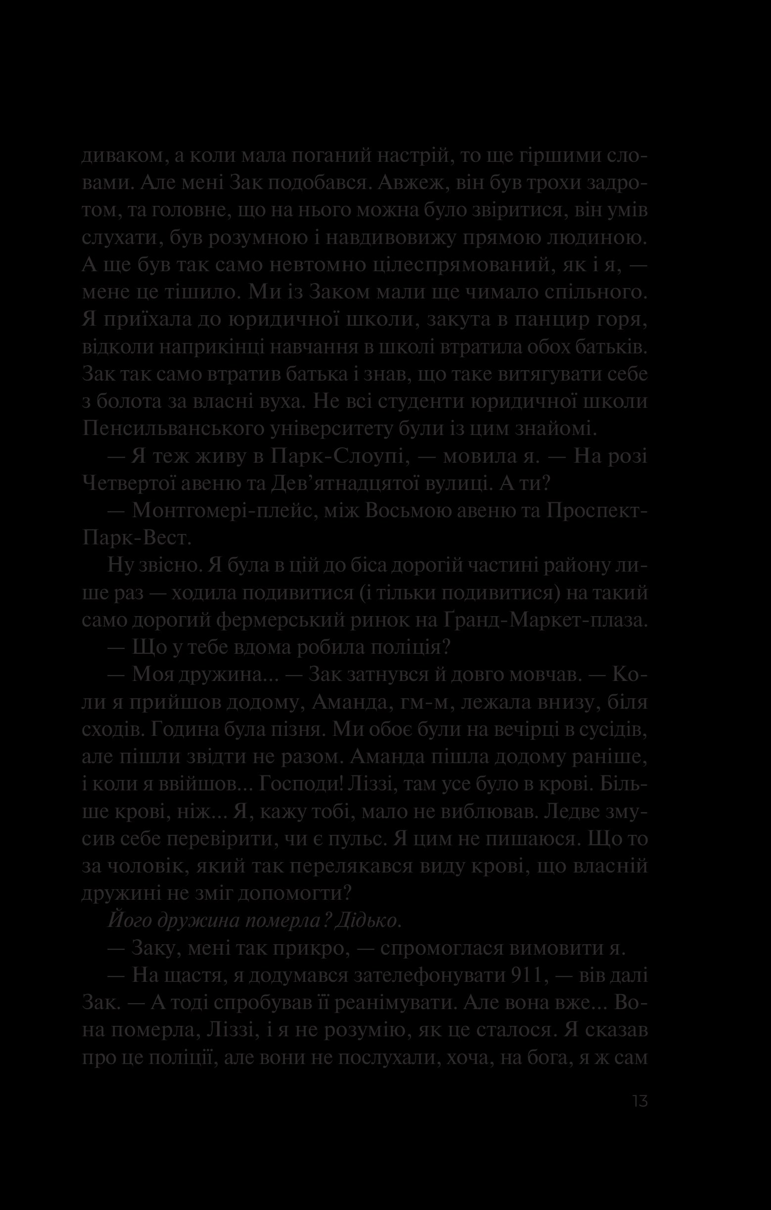 Які знання мала Ліззі про друга дитинства Зака Ґрейсона? Жінка пам’ятала, що він живе своє найкраще життя у Парк-Слоуп — спокійному районі Брукліна зі старовинними маєтками та зеленими вулицями, що у нього є таунхаус і красуня-дружина Аманда, з якою вони живуть душа в душу. Сама ж Ліззі відчуває, як її буття летить під три чорти: втрата прокурорської посади, взаємини з родиною тріщать по всіх швах. Аж раптом дзвінок від Зака оглушує звісткою — Аманда мертва. А сам він не просто головний підозрюваний, а вже й ув’язнений. Друг дитинства благає витягнути його із цієї халепи, адже він, за його словами, не винен.