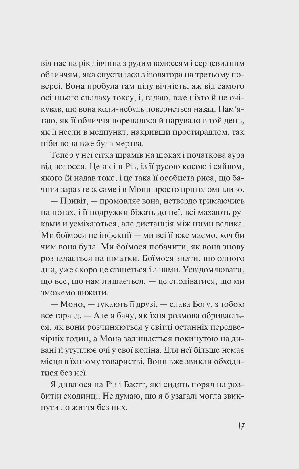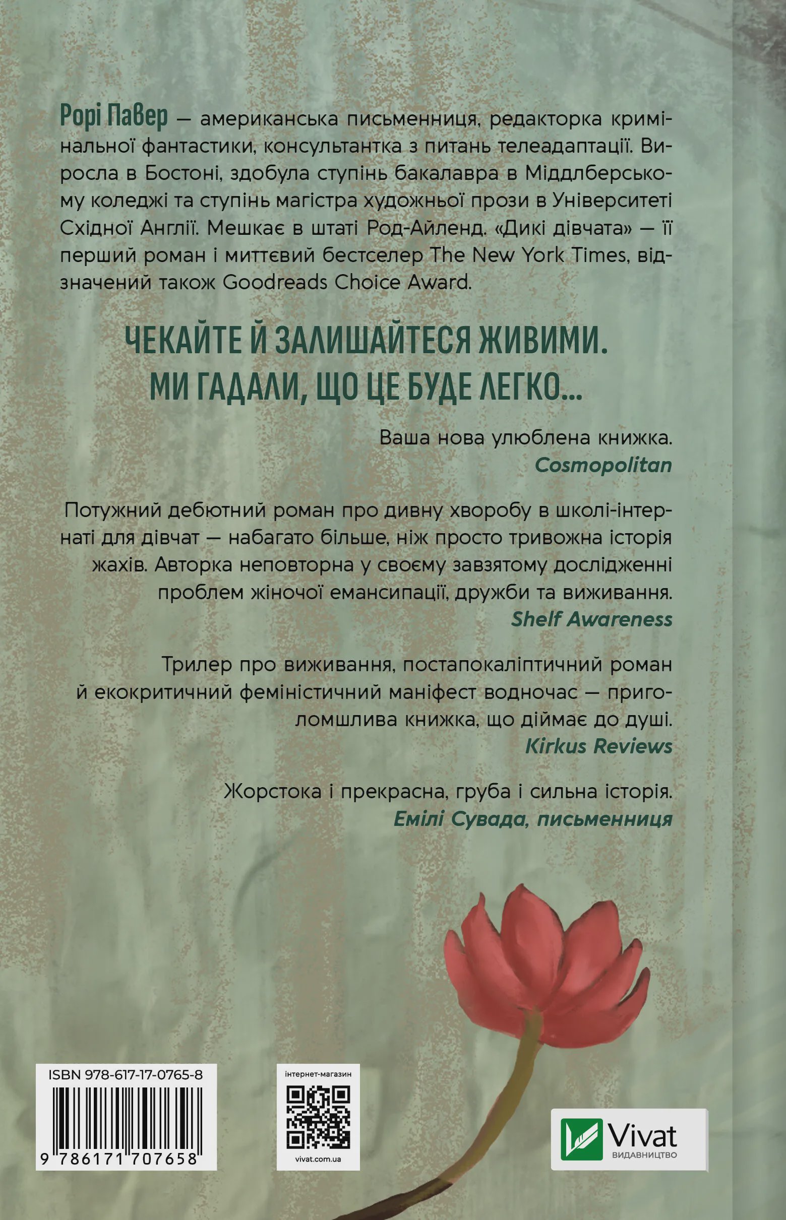 Книга «Дикі дівчата» — це боді-горор від американської письменниці Рорі Павер. Око Гетті неживе, воно назавжди заплющилося через раптове ураження інфекцією. Дівчина відчуває під повікою біль: там щось ворушиться. Однак вона звикла до страждань, а її втрата не така серйозна, як в інших дівчат. Хтось залишився без нормальних кінцівок, а хтось — без життя. Після введення карантину не знайти жодної учениці школи «Ракстер», яка б не була травмована фізично, чи морально. Гетті разом зі своїми подругами повинна вижити й дочекатися ліків проти таємничої хвороби.