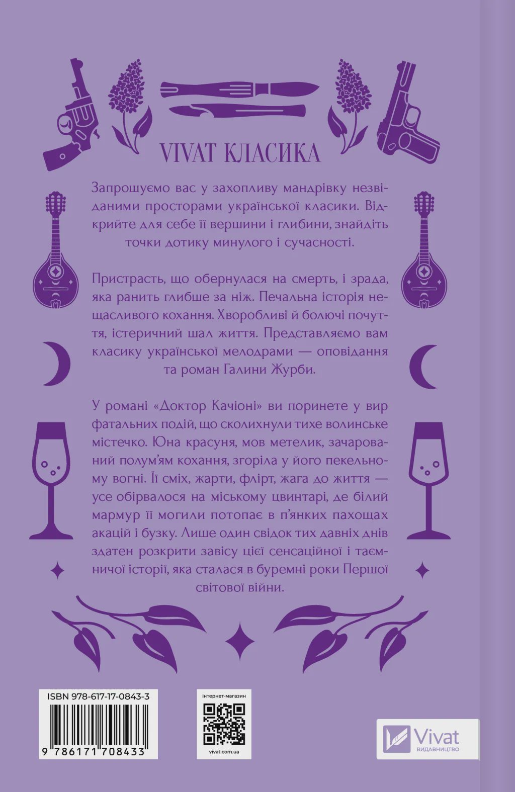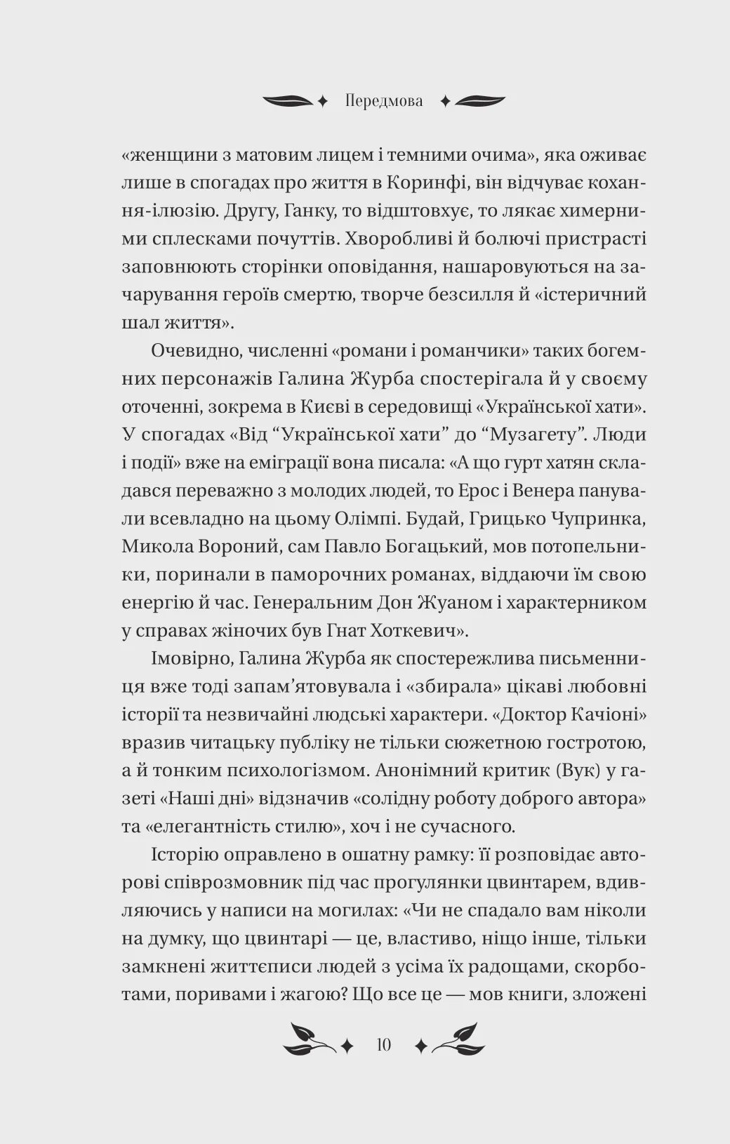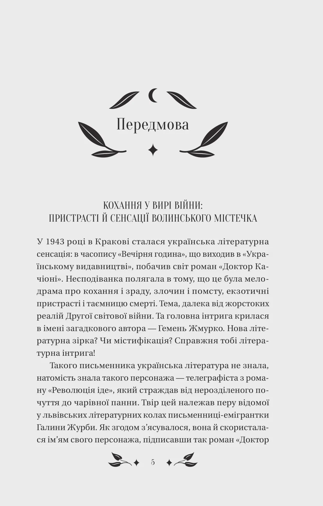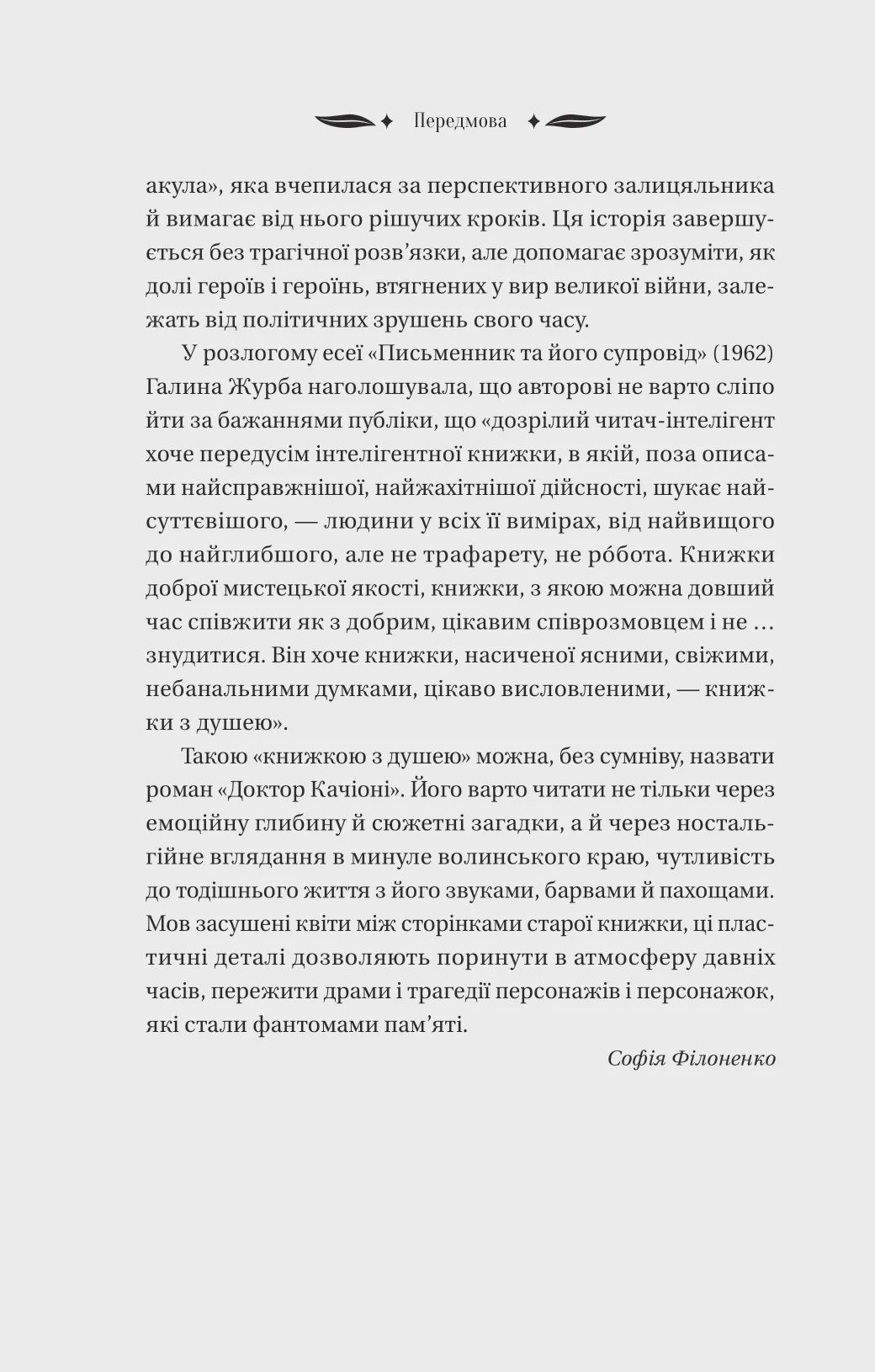 Книга «Доктор Качіоні» знайомить із багатогранною творчістю української письменниці Галини Журби (справжнє прізвище Домбровська, у шлюбі Нивінська). Спадщину мисткині складають імпресіоністичні оповідання, історична трилогія, а також сенсаційний роман, опублікований під псевдонімом Гемень Жмурко кривавого 1943 року. Драматичний сюжет про любовні багатокутники в декораціях провінційного містечка у вирі Першої світової війни нагадував його читачам і читачкам «Звіяних вітром» Маргарет Мітчелл.