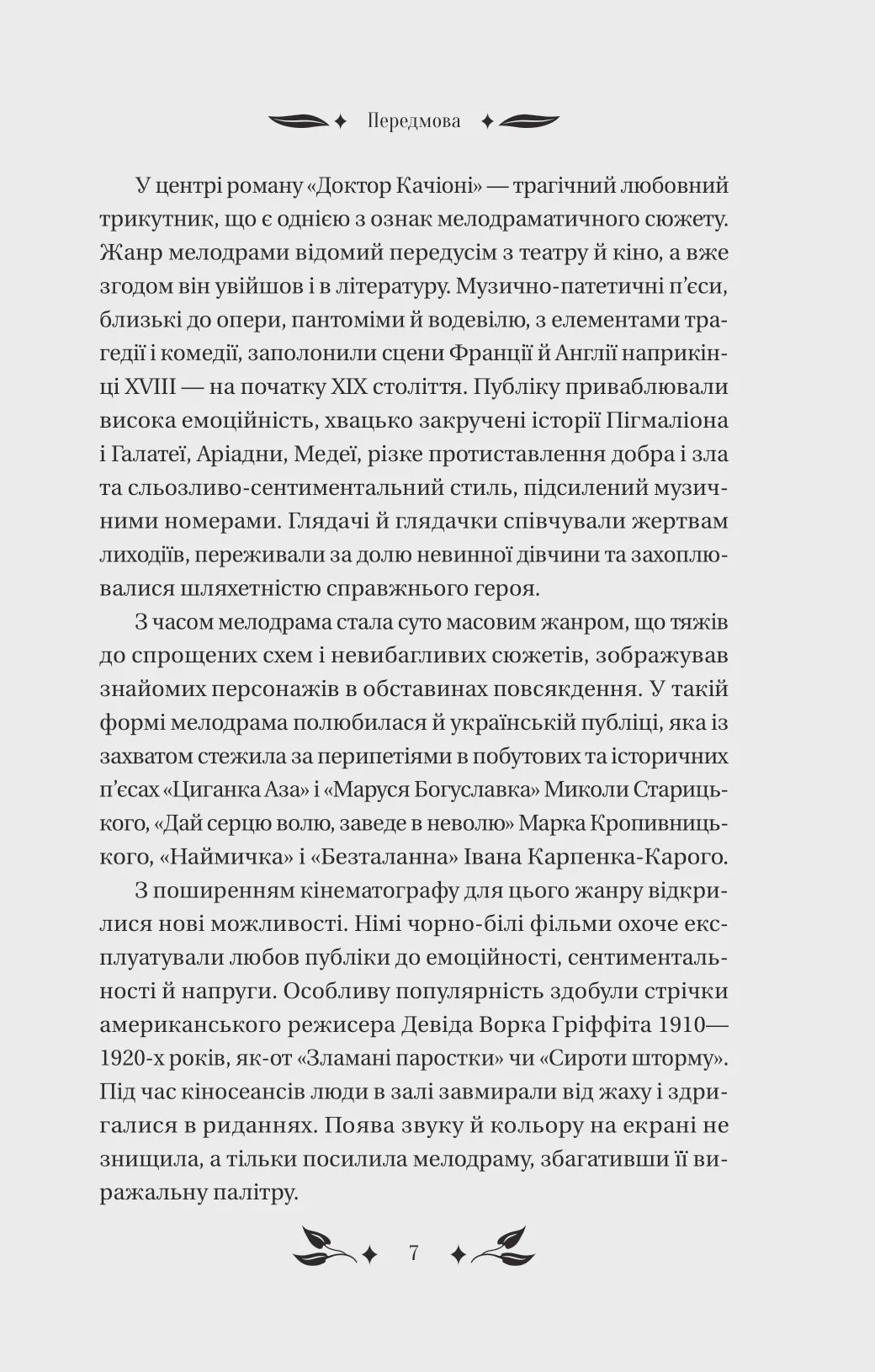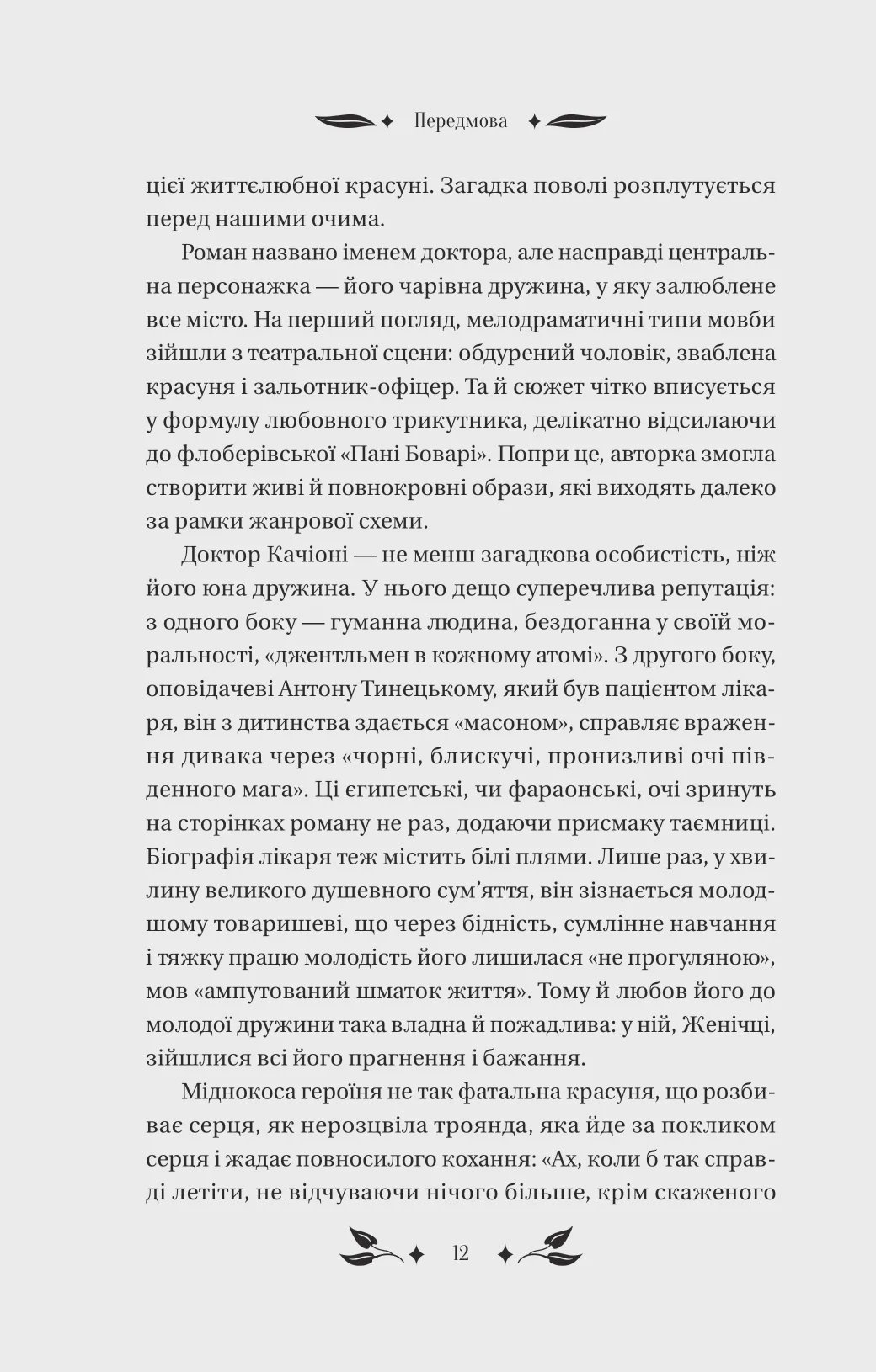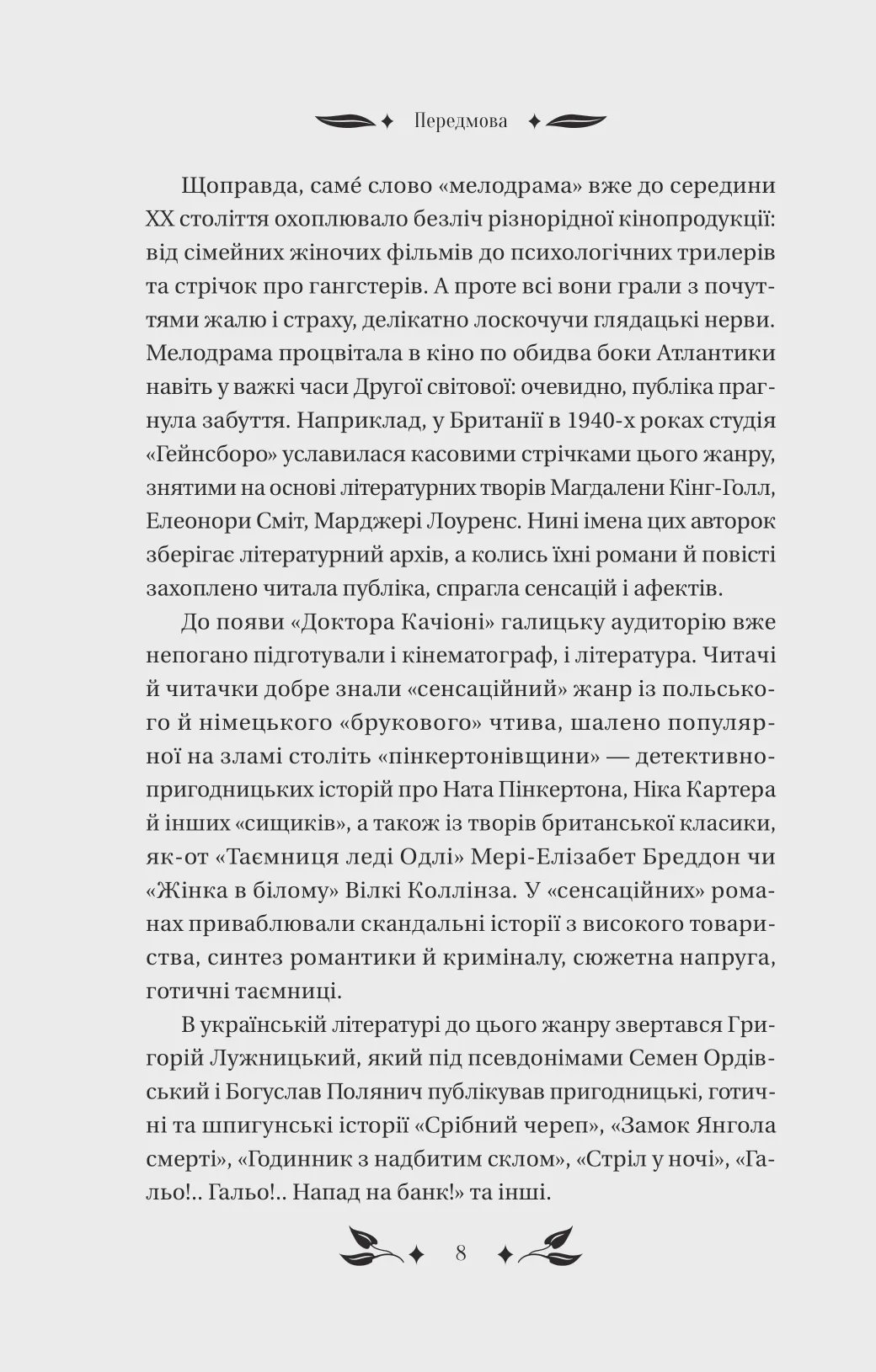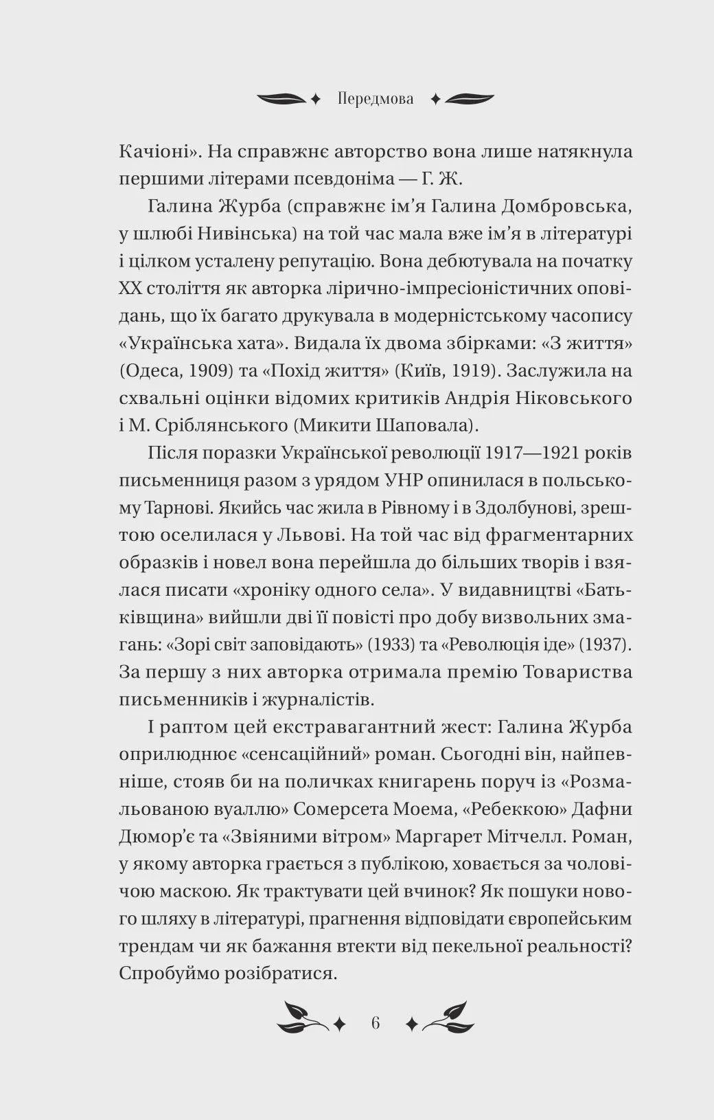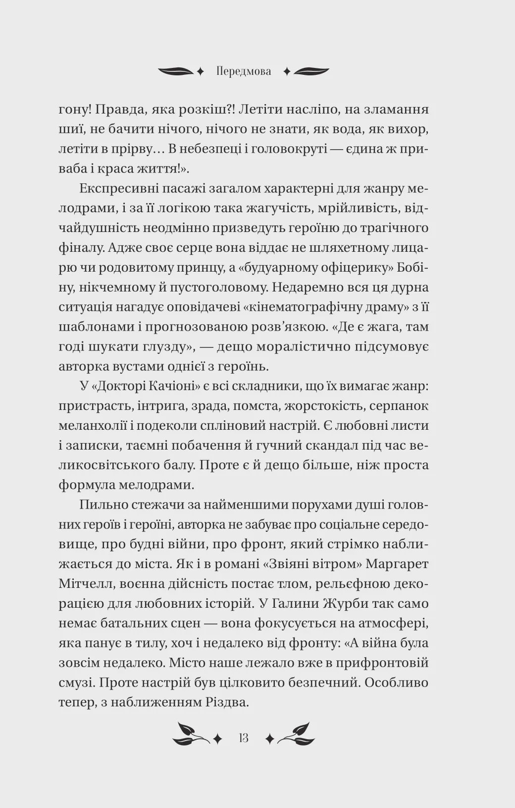 Книга «Доктор Качіоні» знайомить із багатогранною творчістю української письменниці Галини Журби (справжнє прізвище Домбровська, у шлюбі Нивінська). Спадщину мисткині складають імпресіоністичні оповідання, історична трилогія, а також сенсаційний роман, опублікований під псевдонімом Гемень Жмурко кривавого 1943 року. Драматичний сюжет про любовні багатокутники в декораціях провінційного містечка у вирі Першої світової війни нагадував його читачам і читачкам «Звіяних вітром» Маргарет Мітчелл.