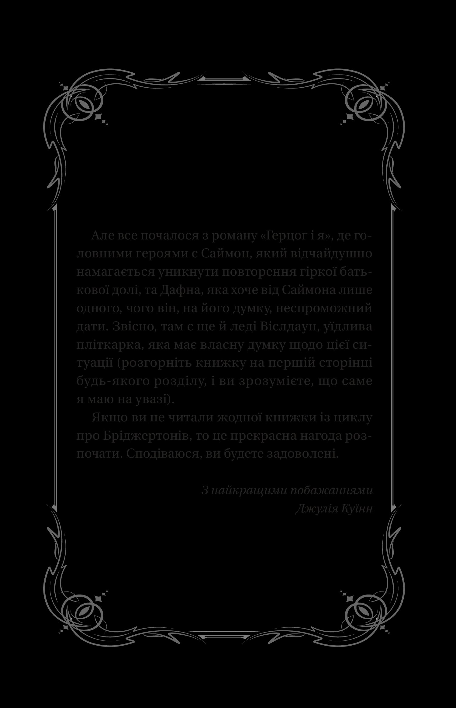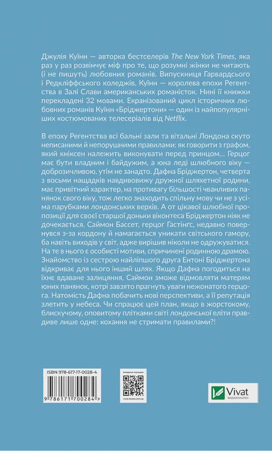В епоху Регентства всі бальні зали та вітальні Лондона скуто неписаними й непорушними правилами: як говорити з графом, який кніксен належить виконувати перед принцом… Герцог має бути владним і байдужим, а юна леді шлюбного віку — доброзичливою, утім не занадто. Дафна Бріджертон, четверта з восьми нащадків навдивовижу дружної шляхетної родини, має привітний характер, на противагу більшості чванливих панянок свого віку, тож легко знаходить спільну мову чи не з усіма парубками лондонських верхів. А от цікавої шлюбної пропозиції для своєї старшої доньки віконтеса Бріджертон ніяк не дочекається. Саймон Бассет, герцог Гастінґс, недавно повернувся з-за кордону й намагається уникати світського гамору, ба навіть виходів у світ, адже вирішив ніколи не одружуватися. На те в нього є особисті мотиви, спричинені родинною драмою. Знайомство із сестрою найліпшого друга Ентоні Бріджертона відкриває для нього інший шлях. Якщо Дафна погодиться на їхнє вдаване залицяння, Саймон зможе відмовляти матерям юних панянок, котрі завзято прагнуть уваги нежонатого герцога. Натомість Дафна побачить нові перспективи, а її репутація злетить у небеса. Чи спрацює цей план, якщо в жорстокому, блискучому, оповитому плітками світі лондонської еліти правдиве лише одне: кохання не стримати правилами.