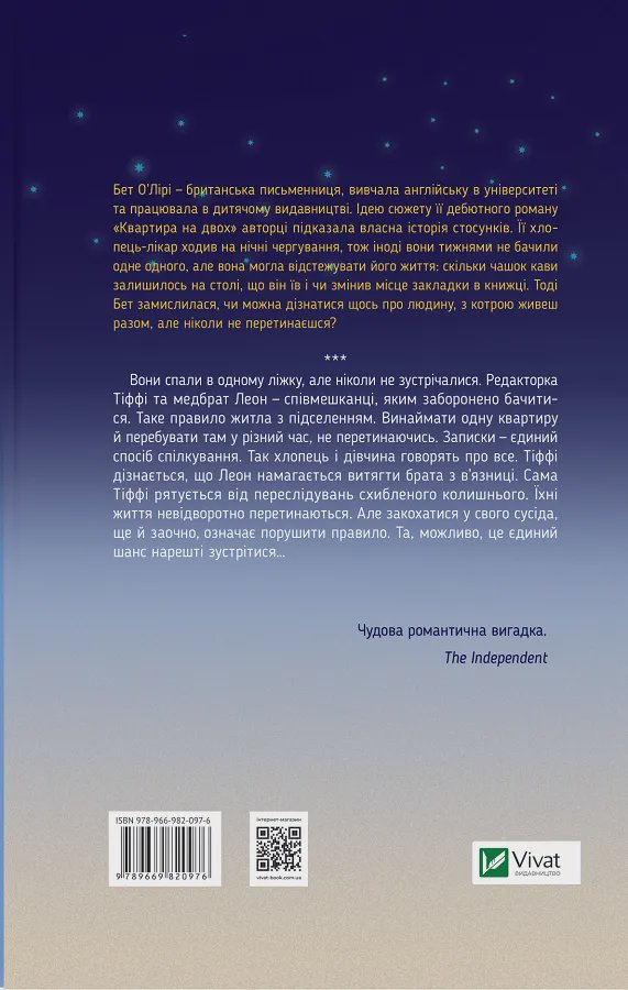 Книга «Квартира на двох» Бет О’Лірі — це сентиментальний роман з елементами драми та ромкому. Книга британської письменниці має високі рейтинги — 4,1 на Goodreads та 4,5 на Amazon. Роман перекладено понад 30 мовами світу, за мотивами книги у 2022 році вийшов серіал на Paramount+.