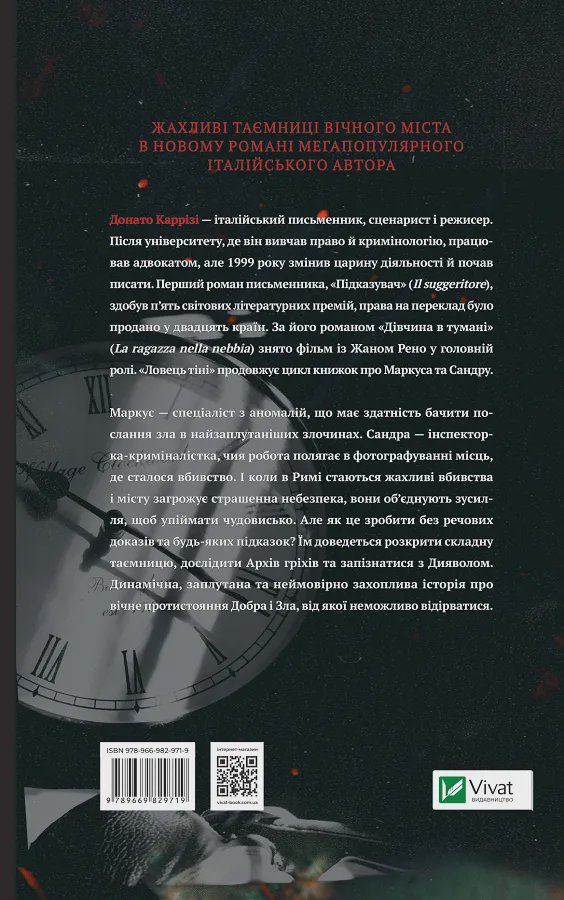 Книга «Ловець тіні» Донато Каррізі — друга частина трилогії «Маркус» та продовження книги «Ловець невинних душ» італійського письменника, криміналіста та кінорежисера Донато Каррізі. Події, що відбуваються на «Темному боці Риму» вчергове наводять жах на місцевих мешканців. Жахливі вбивства пар, в яких чоловіків знищують тихо і непомітно, а жінок — з особливою жорстокістю, безсила розкрити поліція, а отже, настав час залучити наших головних героїв.