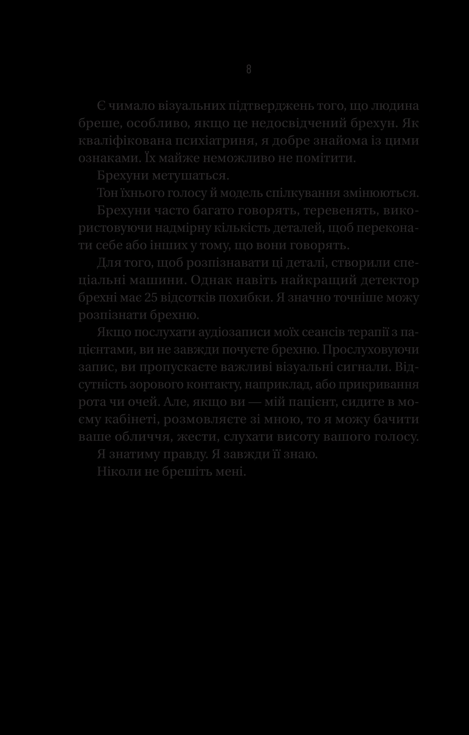Романом «Ніколи не бреши» Фріда Мак-Фадден вчергове пропонує читачам історію, темп якої захоплює, а фінал залишає під невимовними враженнями.
