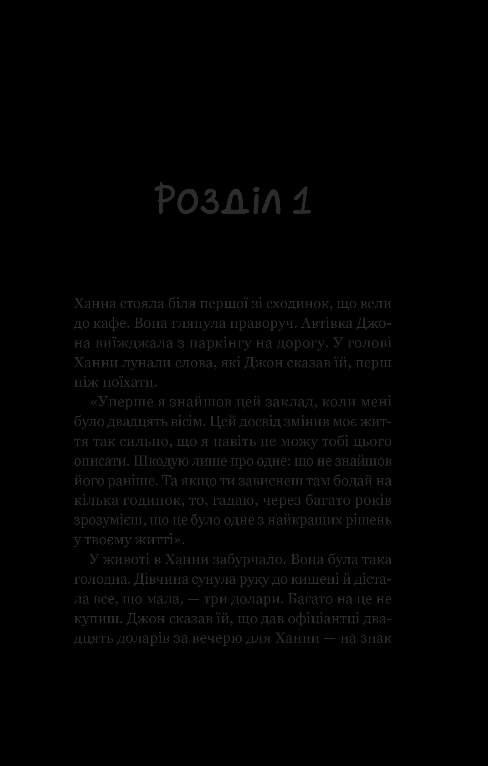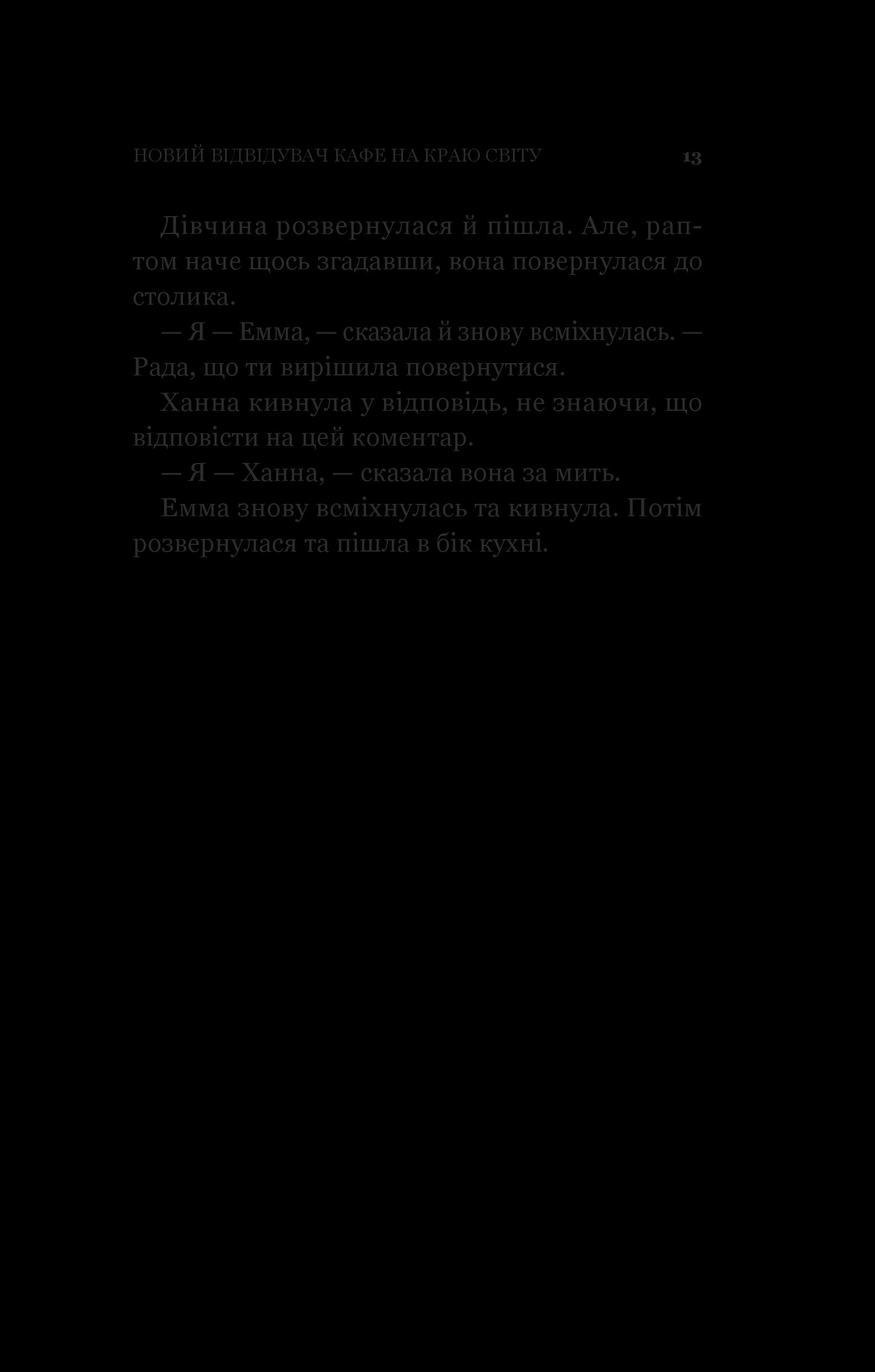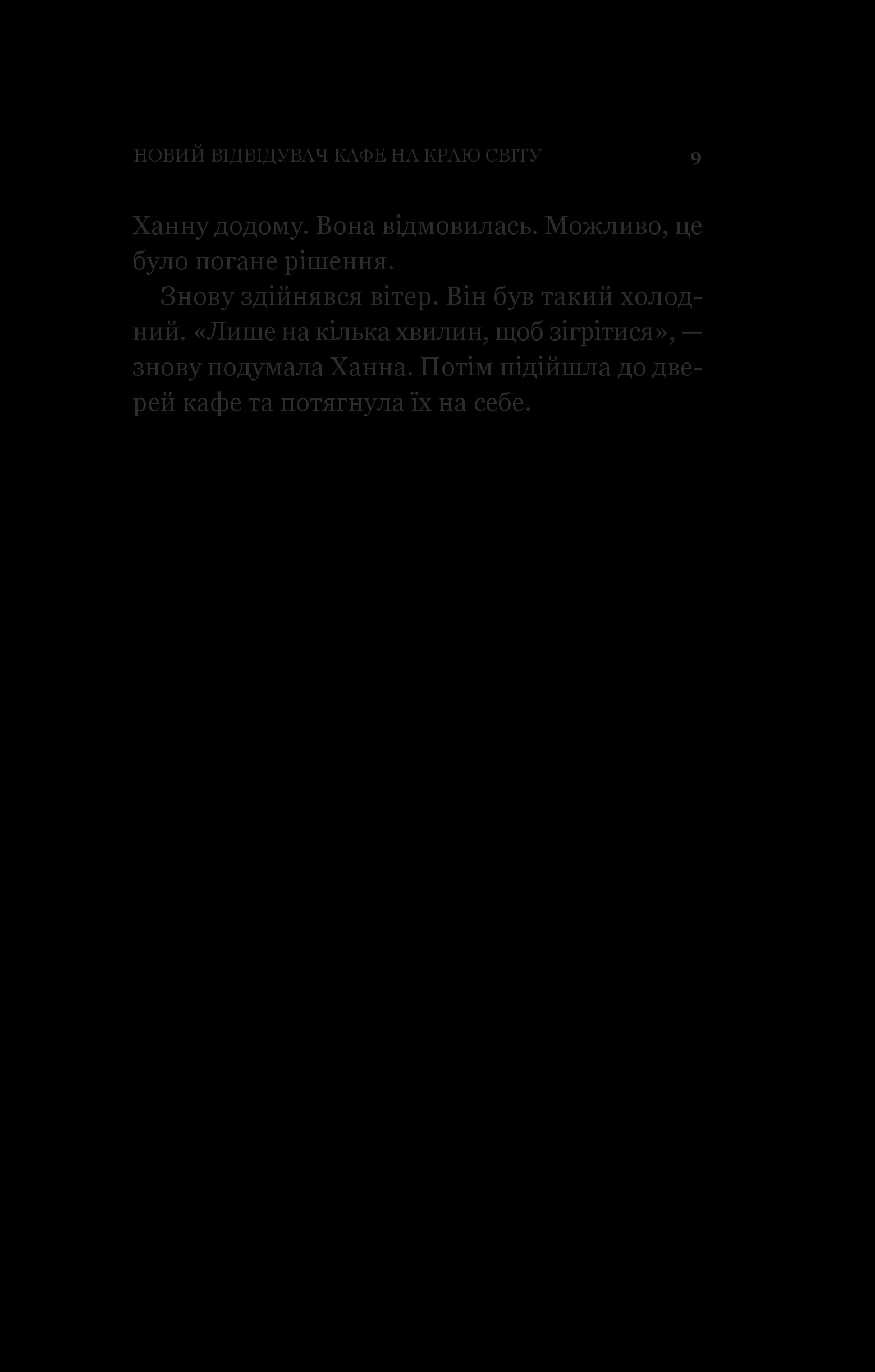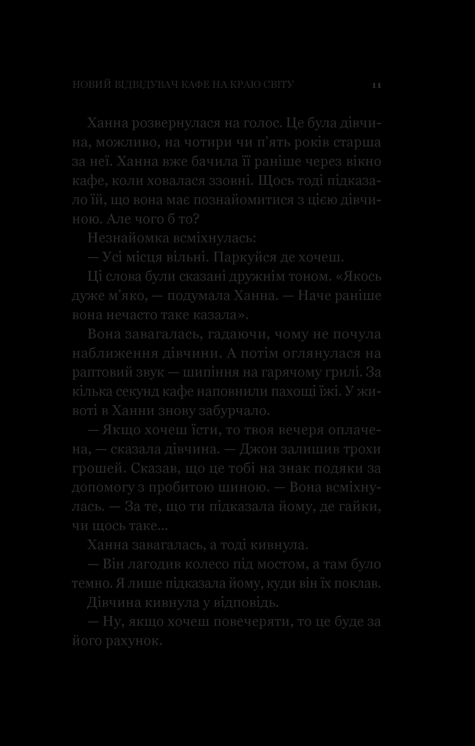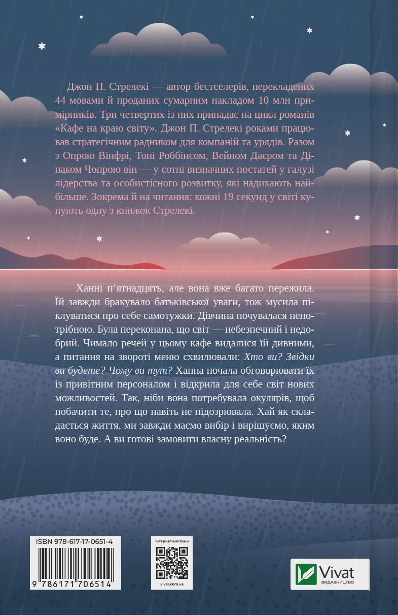 Ханні п’ятнадцять, але вона вже багато пережила. Їй завжди бракувало батьківської уваги, тож мусила піклуватися про себе самотужки. Дівчина почувалася непотрібною. Була переконана, що світ — небезпечний і недобрий. Чимало речей у цьому кафе видалися їй дивними, а питання на звороті меню схвилювали: Хто ви? Звідки ви будете? Чому ви тут? Ханна почала обговорювати їх із привітним персоналом і відкрила для себе світ нових можливостей. Так, ніби вона потребувала окулярів, щоб побачити те, про що навіть не підозрювала. Хай як складається життя, ми завжди маємо вибір і вирішуємо, яким воно буде. А ви готові замовити власну реальність?