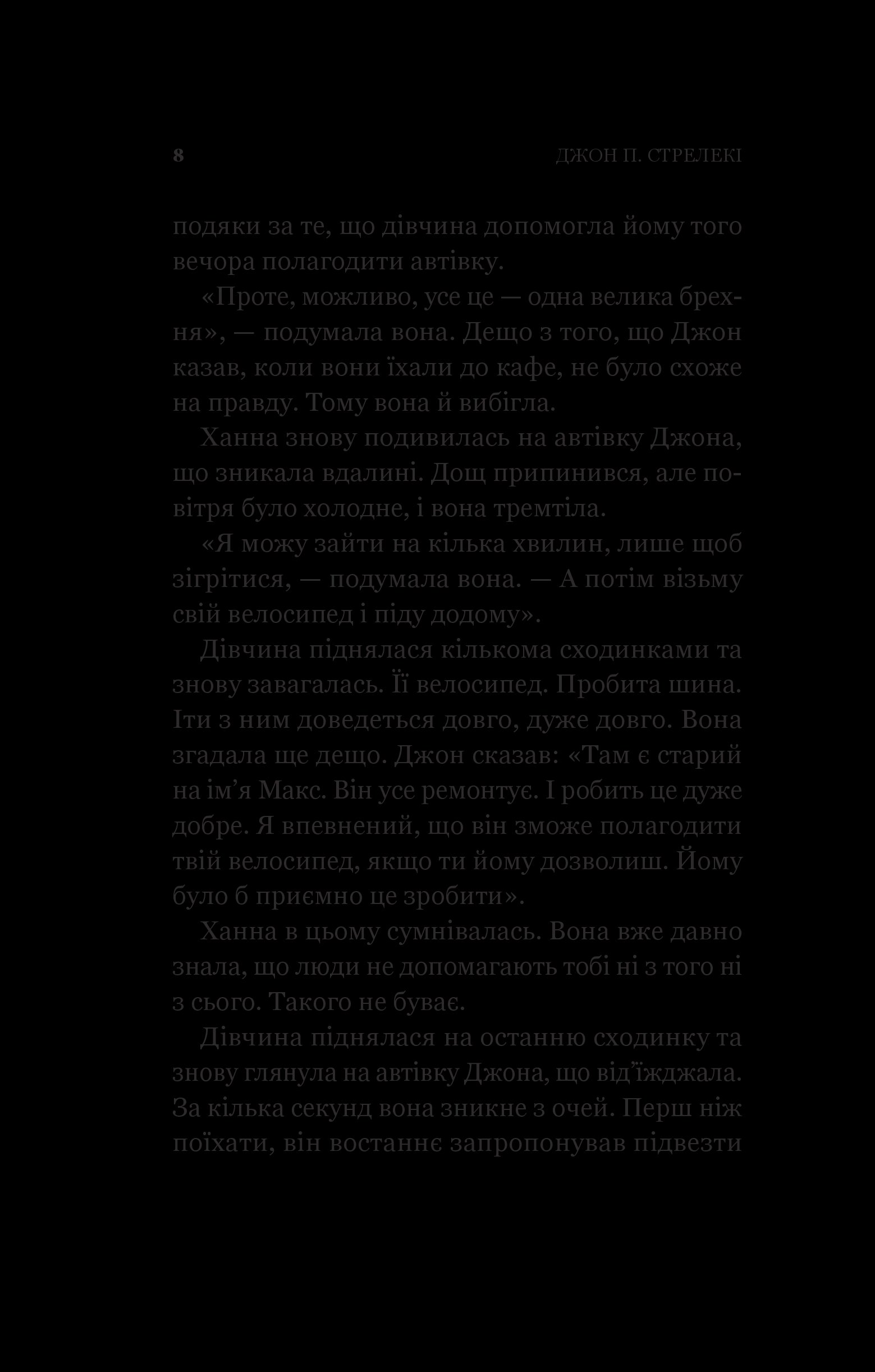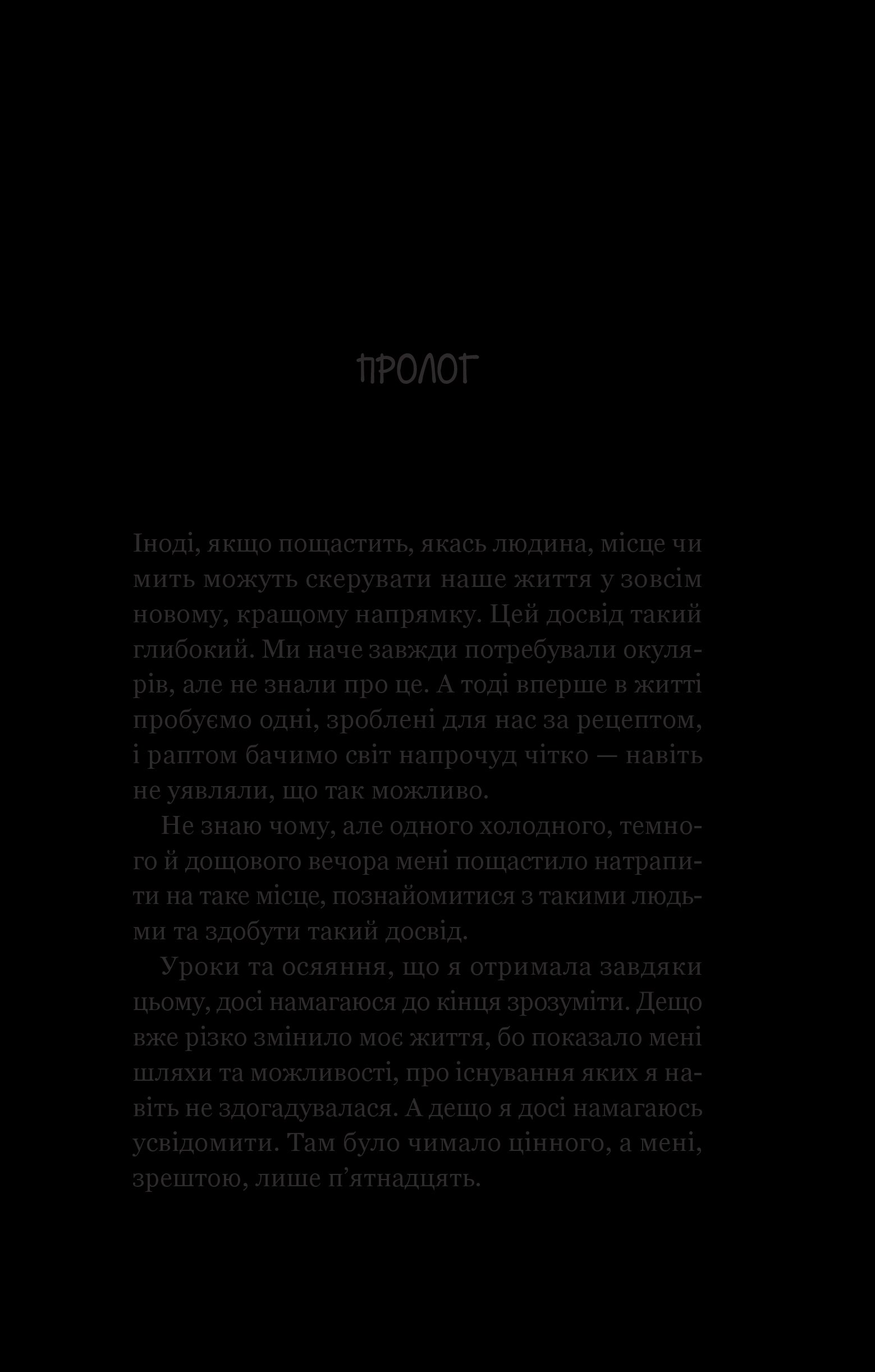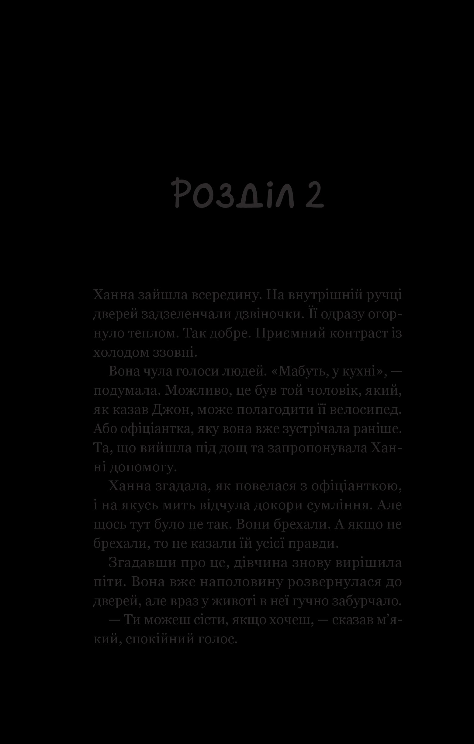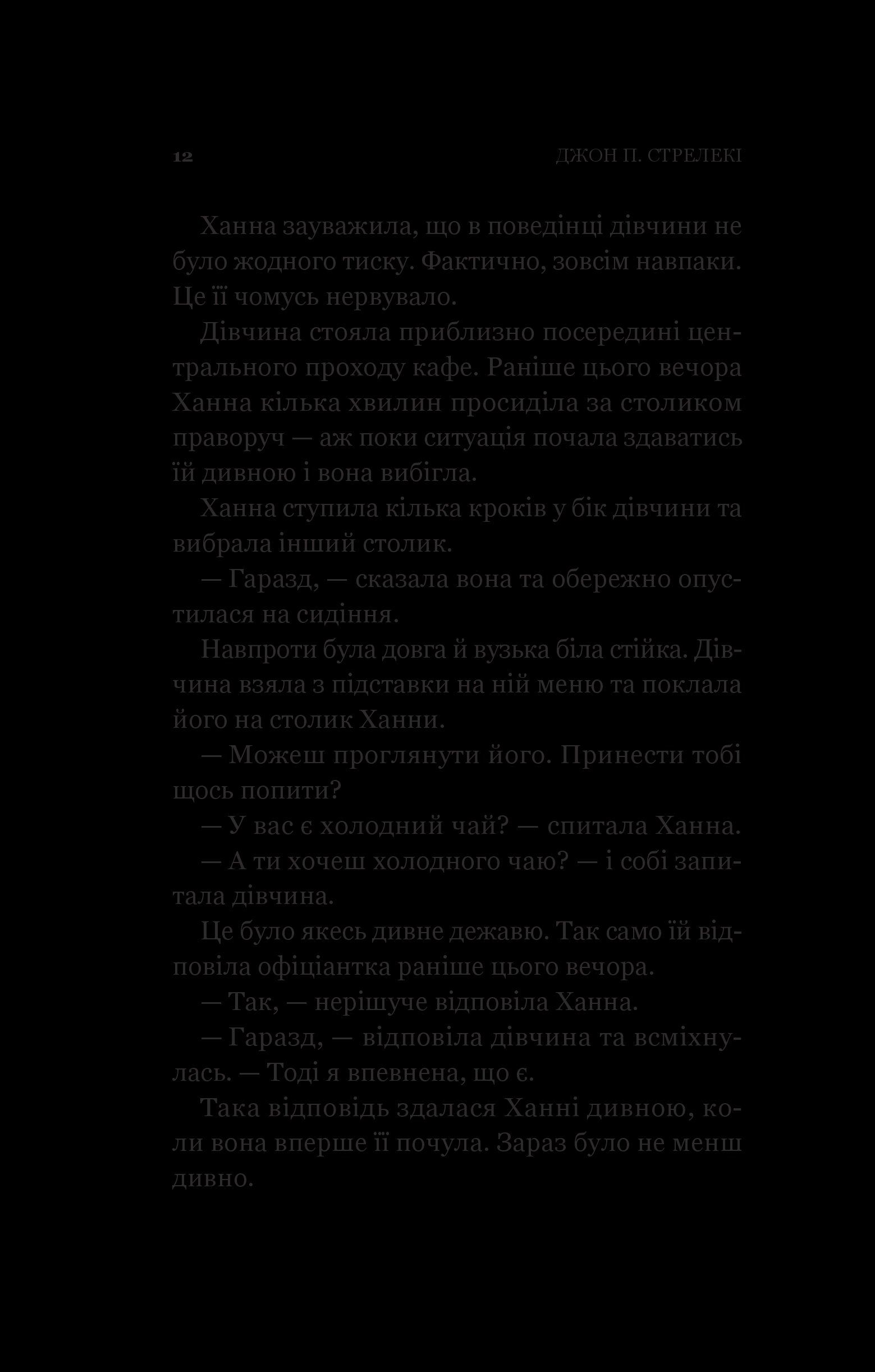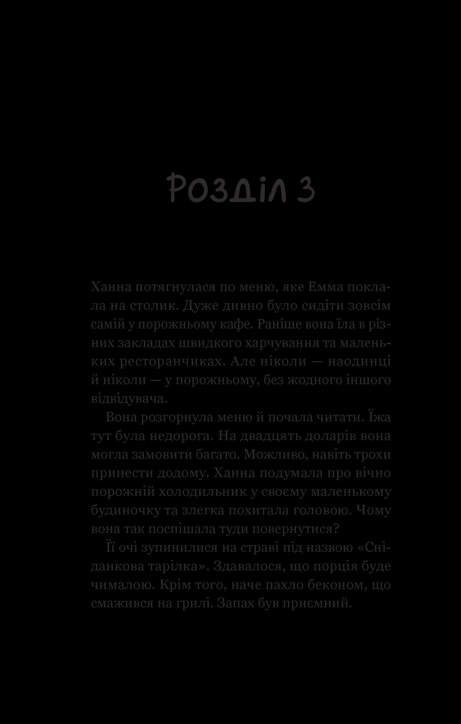 Ханні п’ятнадцять, але вона вже багато пережила. Їй завжди бракувало батьківської уваги, тож мусила піклуватися про себе самотужки. Дівчина почувалася непотрібною. Була переконана, що світ — небезпечний і недобрий. Чимало речей у цьому кафе видалися їй дивними, а питання на звороті меню схвилювали: Хто ви? Звідки ви будете? Чому ви тут? Ханна почала обговорювати їх із привітним персоналом і відкрила для себе світ нових можливостей. Так, ніби вона потребувала окулярів, щоб побачити те, про що навіть не підозрювала. Хай як складається життя, ми завжди маємо вибір і вирішуємо, яким воно буде. А ви готові замовити власну реальність?