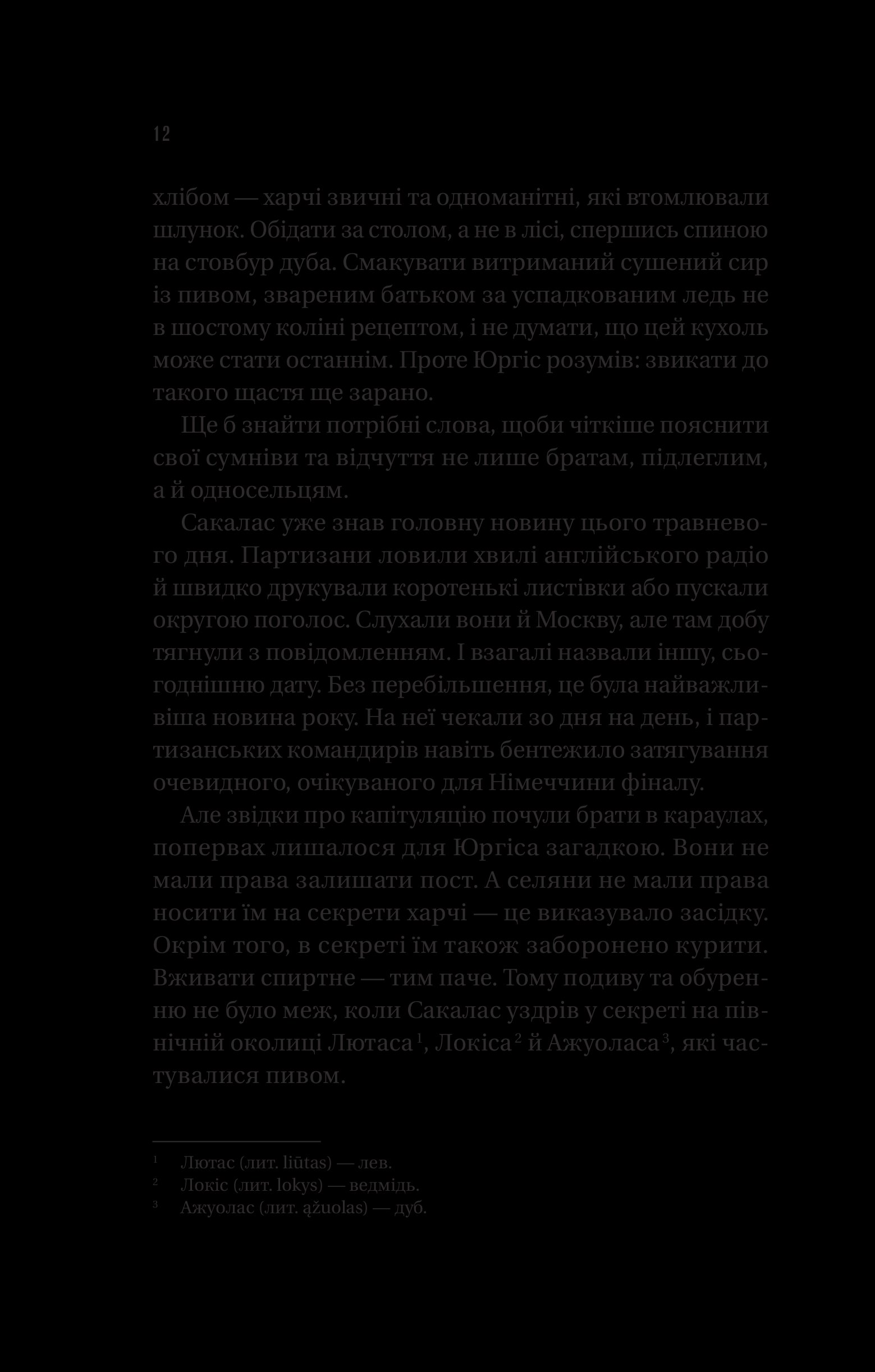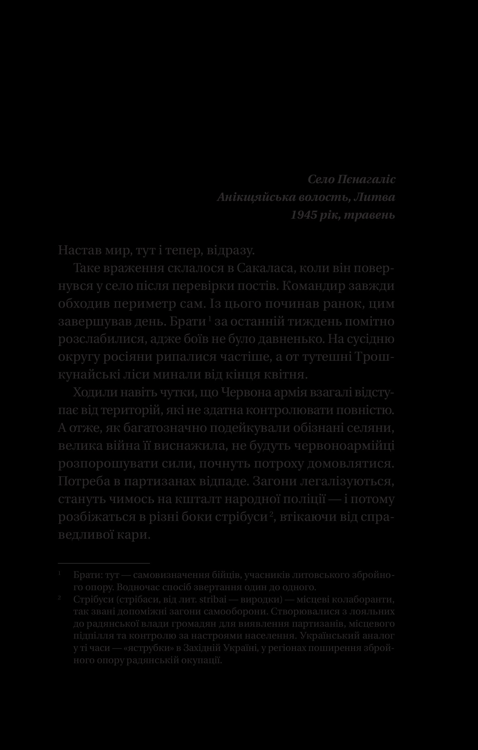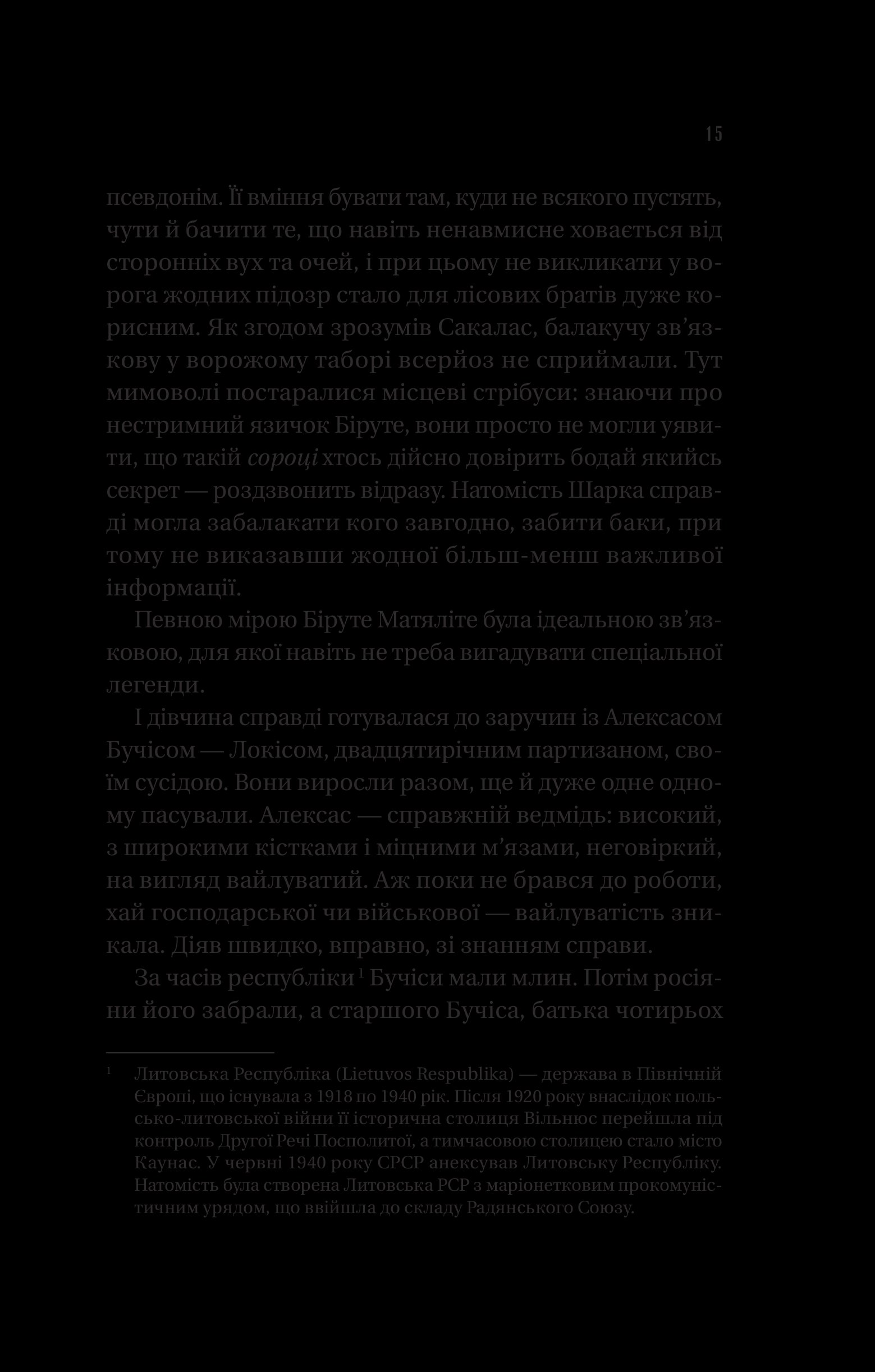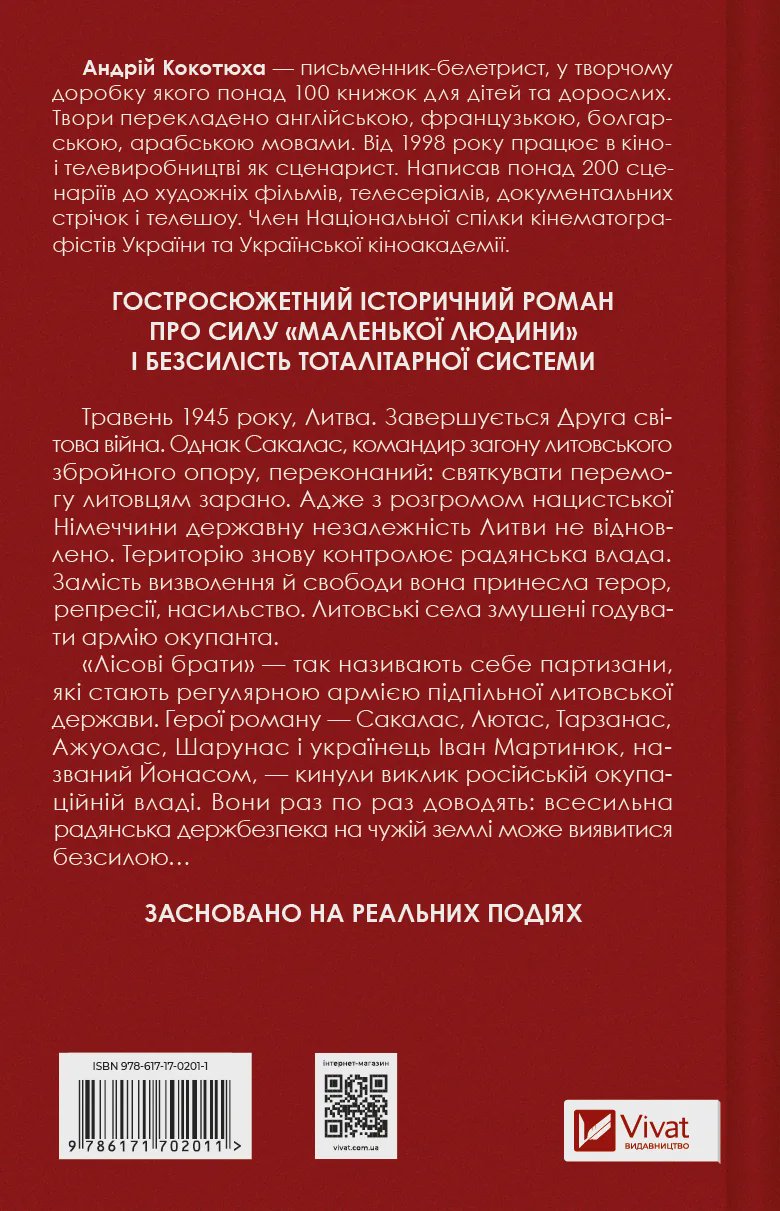 Литовські села змушені годувати армію окупанта. «Лісові брати» — так називають себе партизани, які стають регулярною армією підпільної литовської держави. Герої роману, Сакалас, Лютас, Тарзанас, Ажуолас, Шарунас і українець Іван Мартинюк, названий Йонасом, являють читачам колективний портрет повстанців, що кинули виклик російській окупаційній владі. Вони раз по раз доводять: всесильна радянська держбезпека на чужій землі може виявитися безсилою…