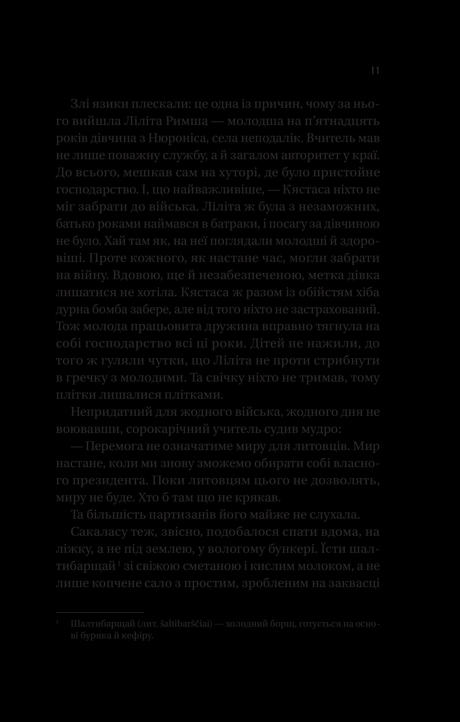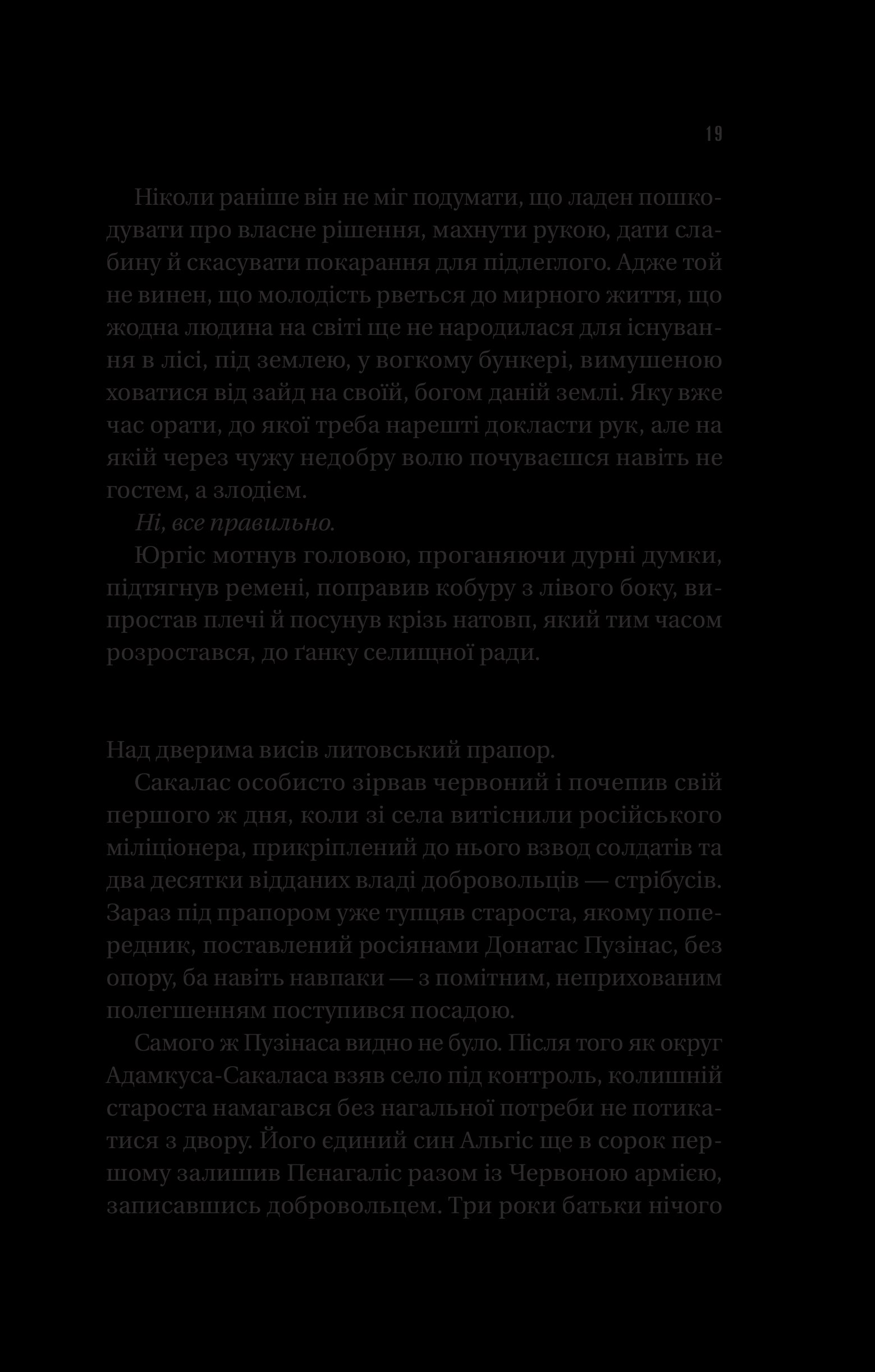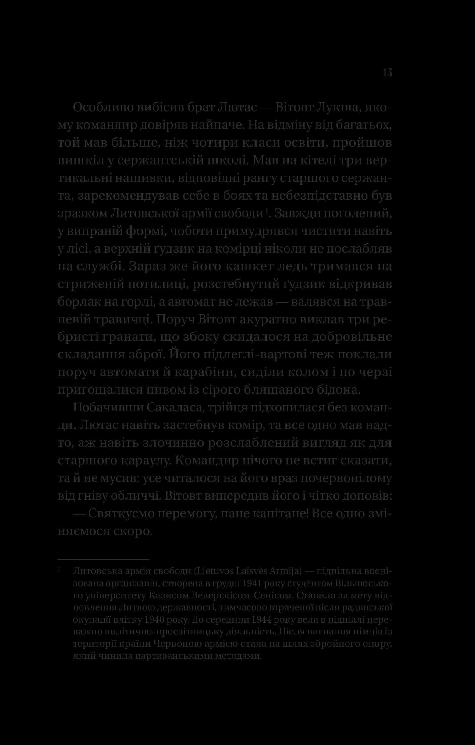 Литовські села змушені годувати армію окупанта. «Лісові брати» — так називають себе партизани, які стають регулярною армією підпільної литовської держави. Герої роману, Сакалас, Лютас, Тарзанас, Ажуолас, Шарунас і українець Іван Мартинюк, названий Йонасом, являють читачам колективний портрет повстанців, що кинули виклик російській окупаційній владі. Вони раз по раз доводять: всесильна радянська держбезпека на чужій землі може виявитися безсилою…