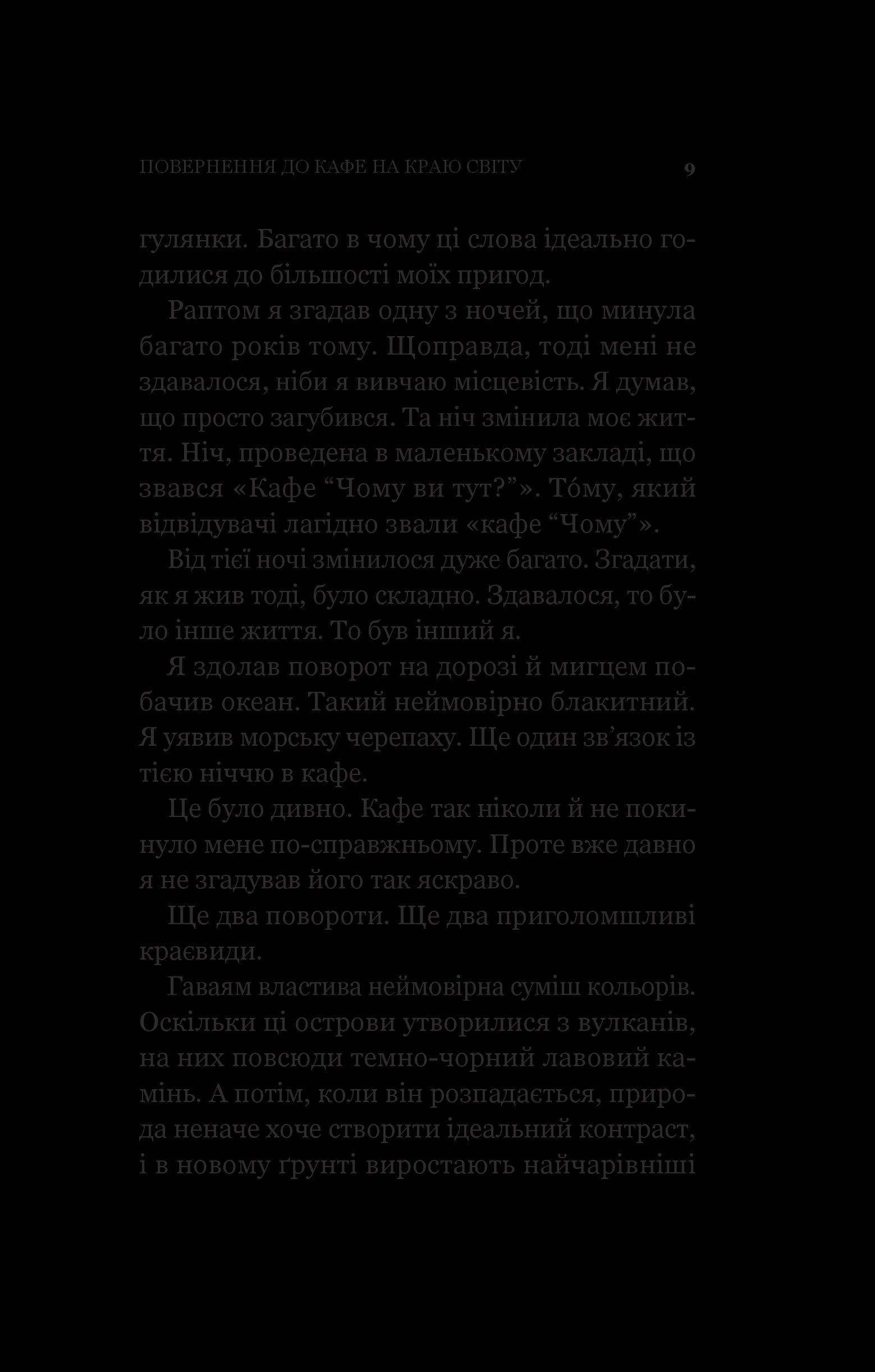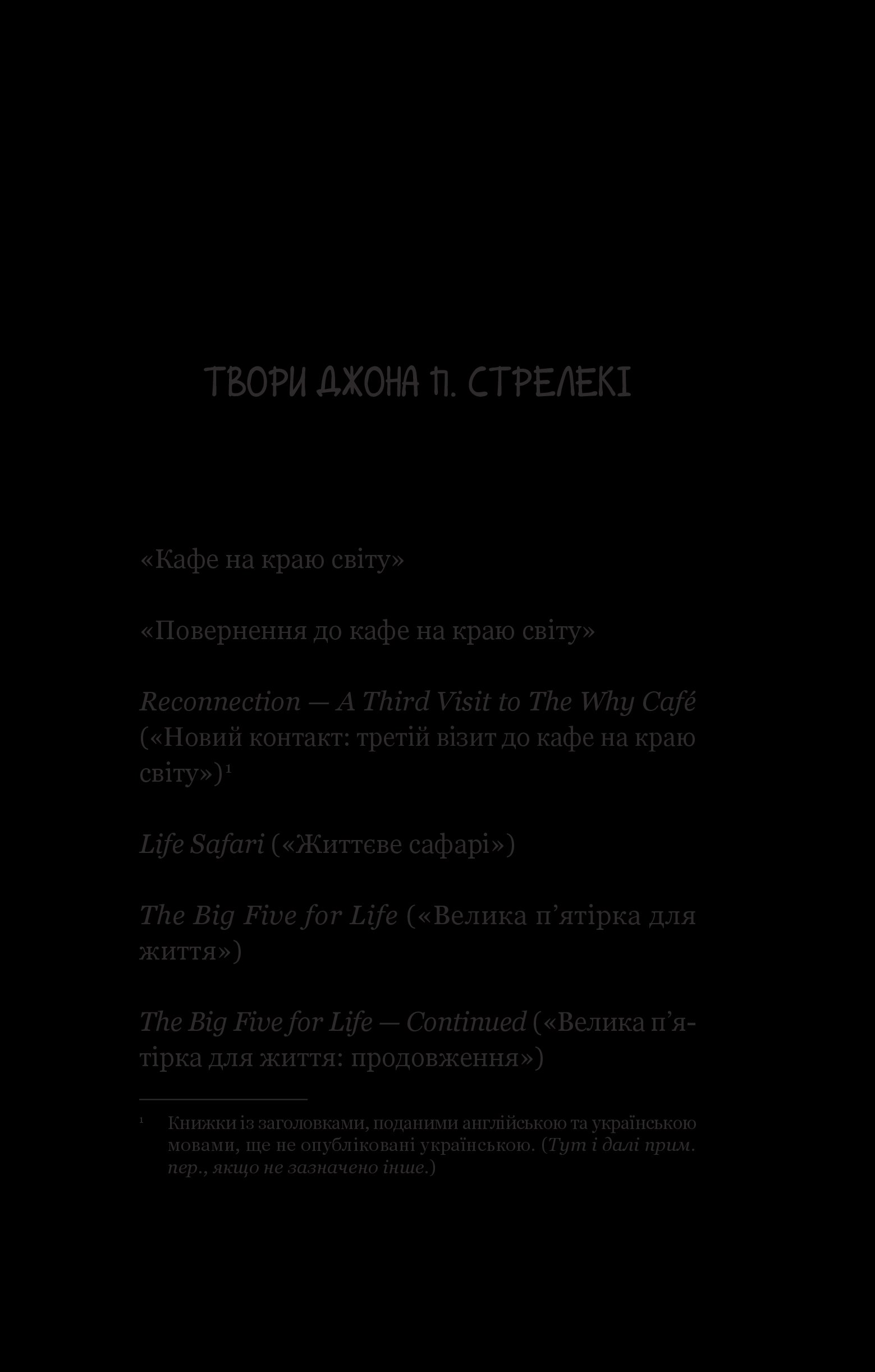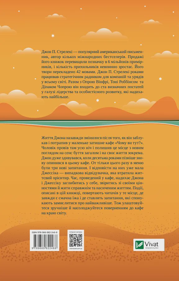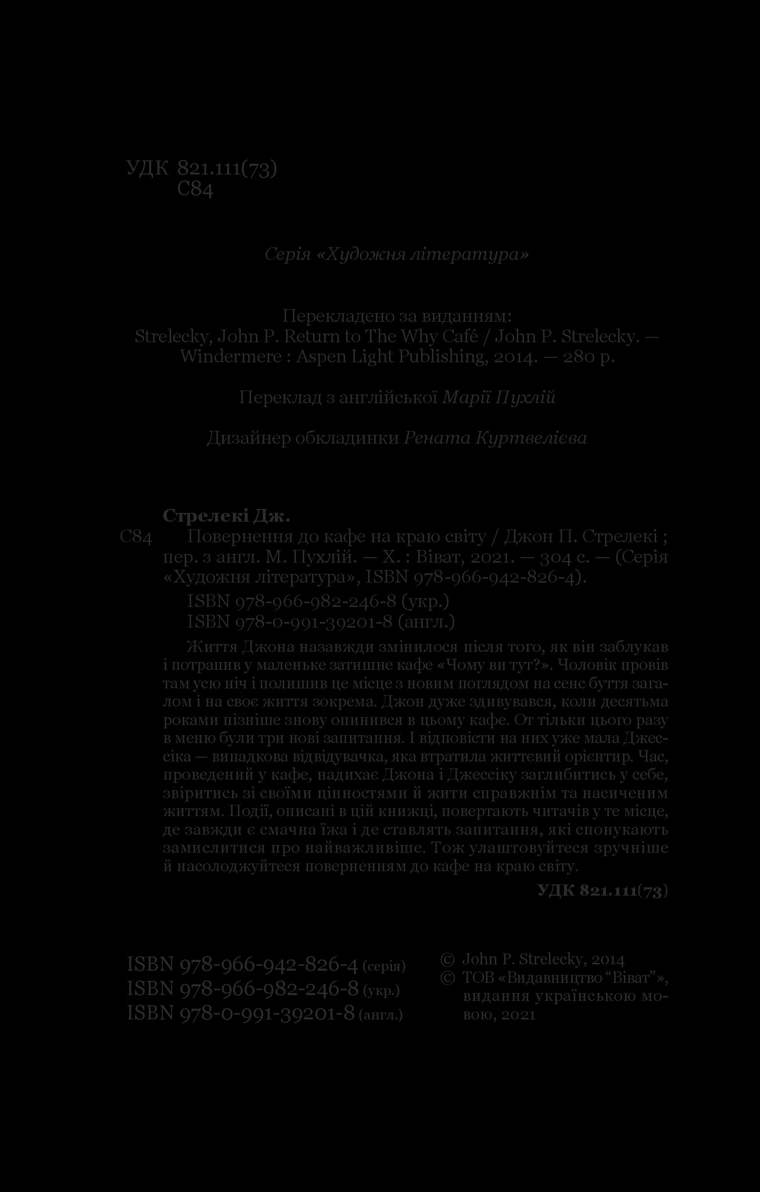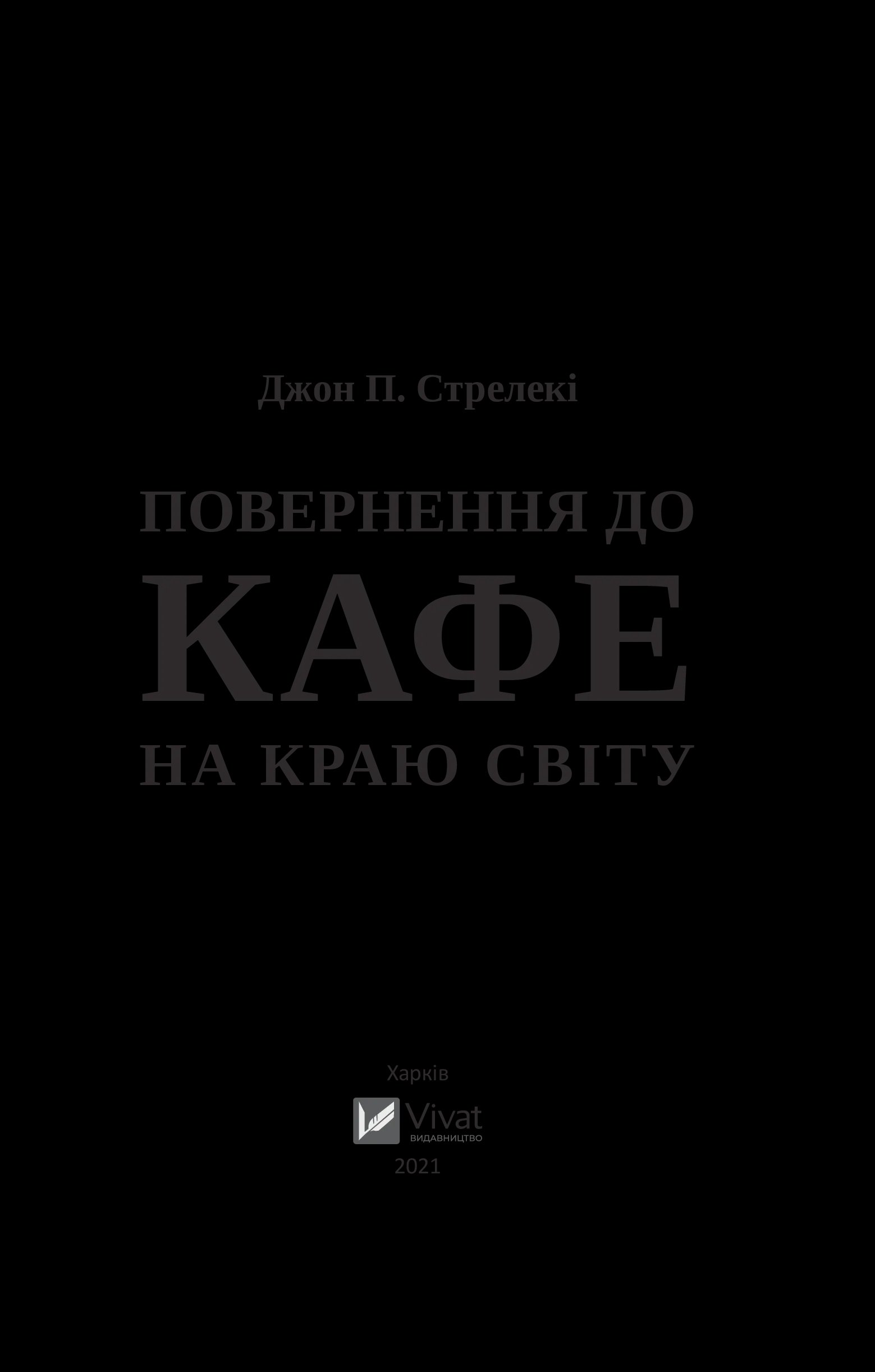 Книга «Повернення до кафе на краю світу» всесвітньо відомого мандрівника та коуча Джона П. Стрелекі є продовженням серії про дивовижний заклад, де відкриваєш меню — і зустрічаєш найглибші та найважливіші питання у житті: «Чому ви тут?», «Чи боїтеся ви смерті?», «Чи вдоволені ви?».
