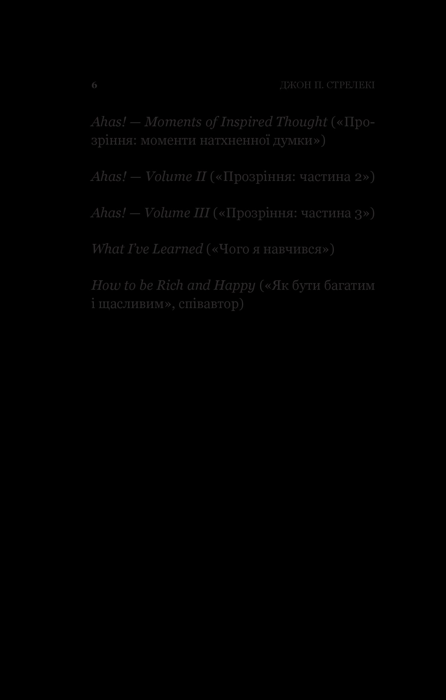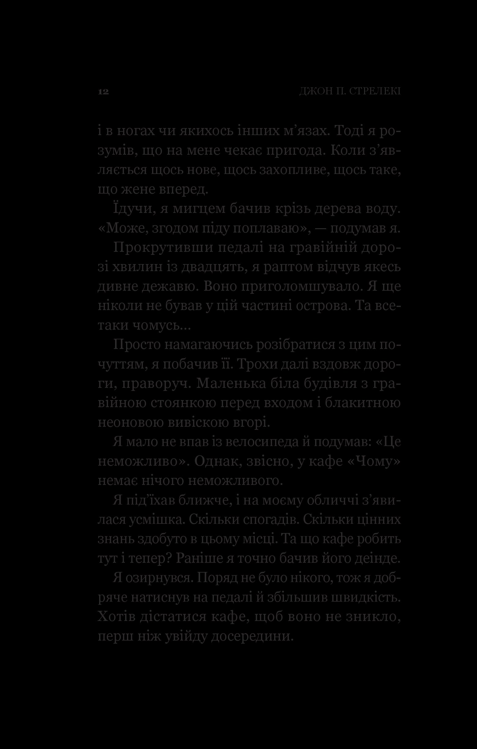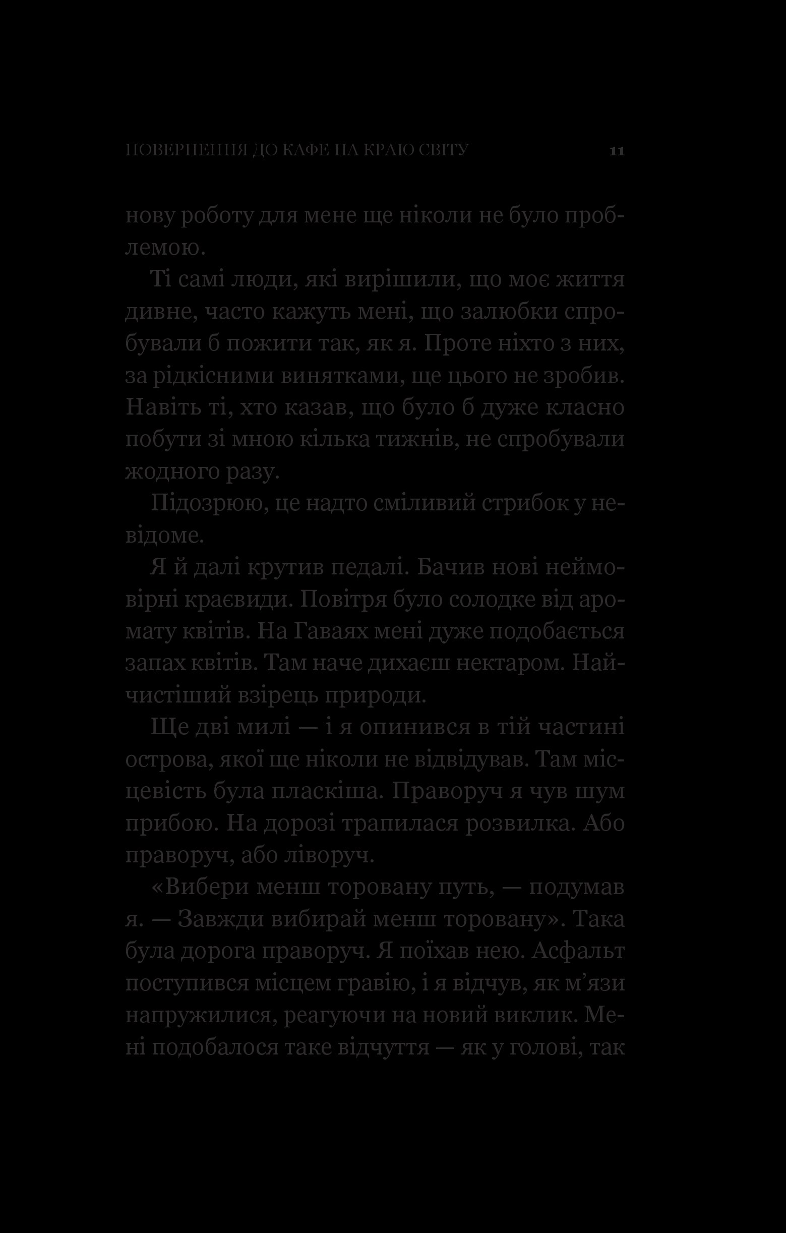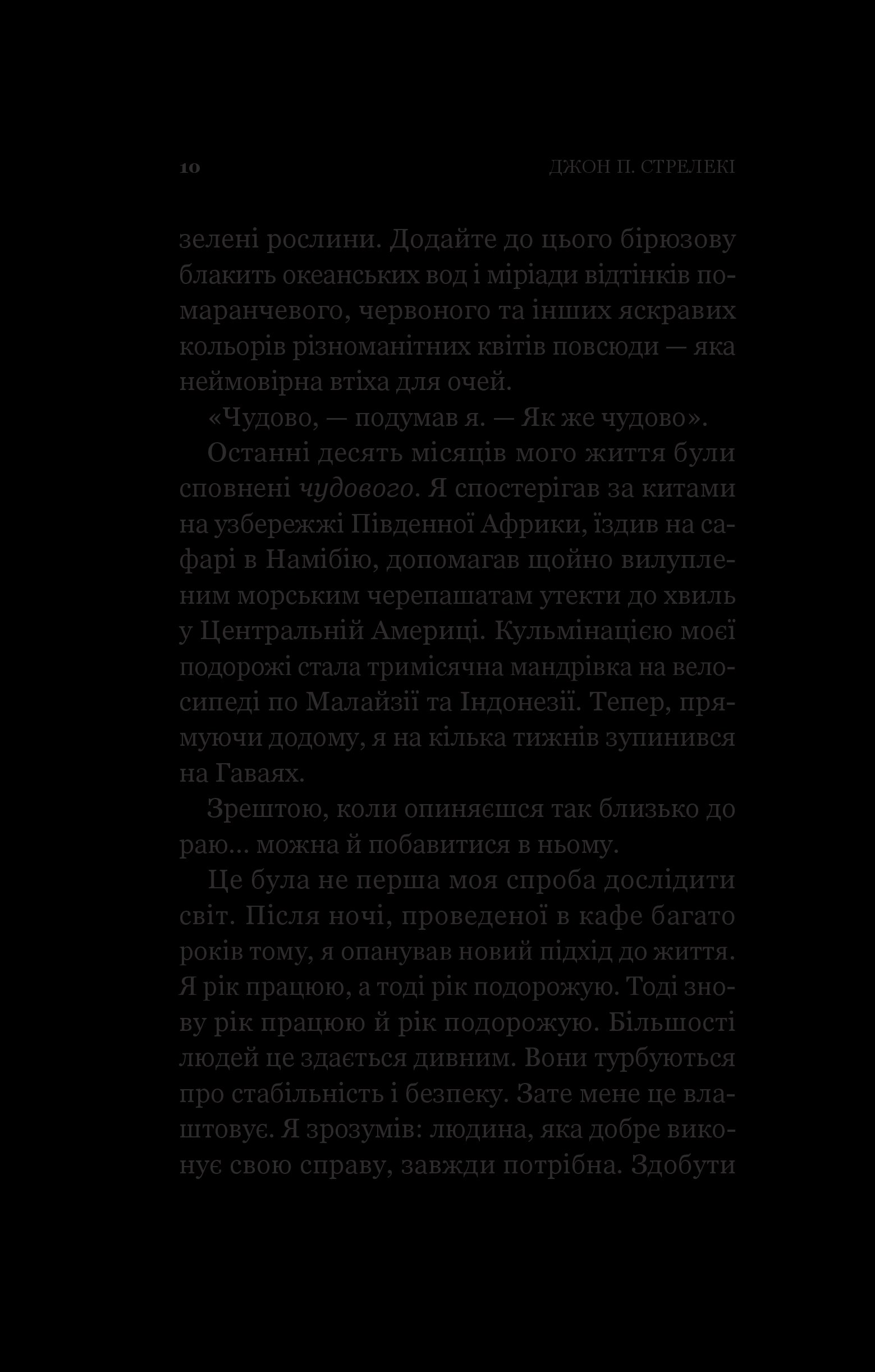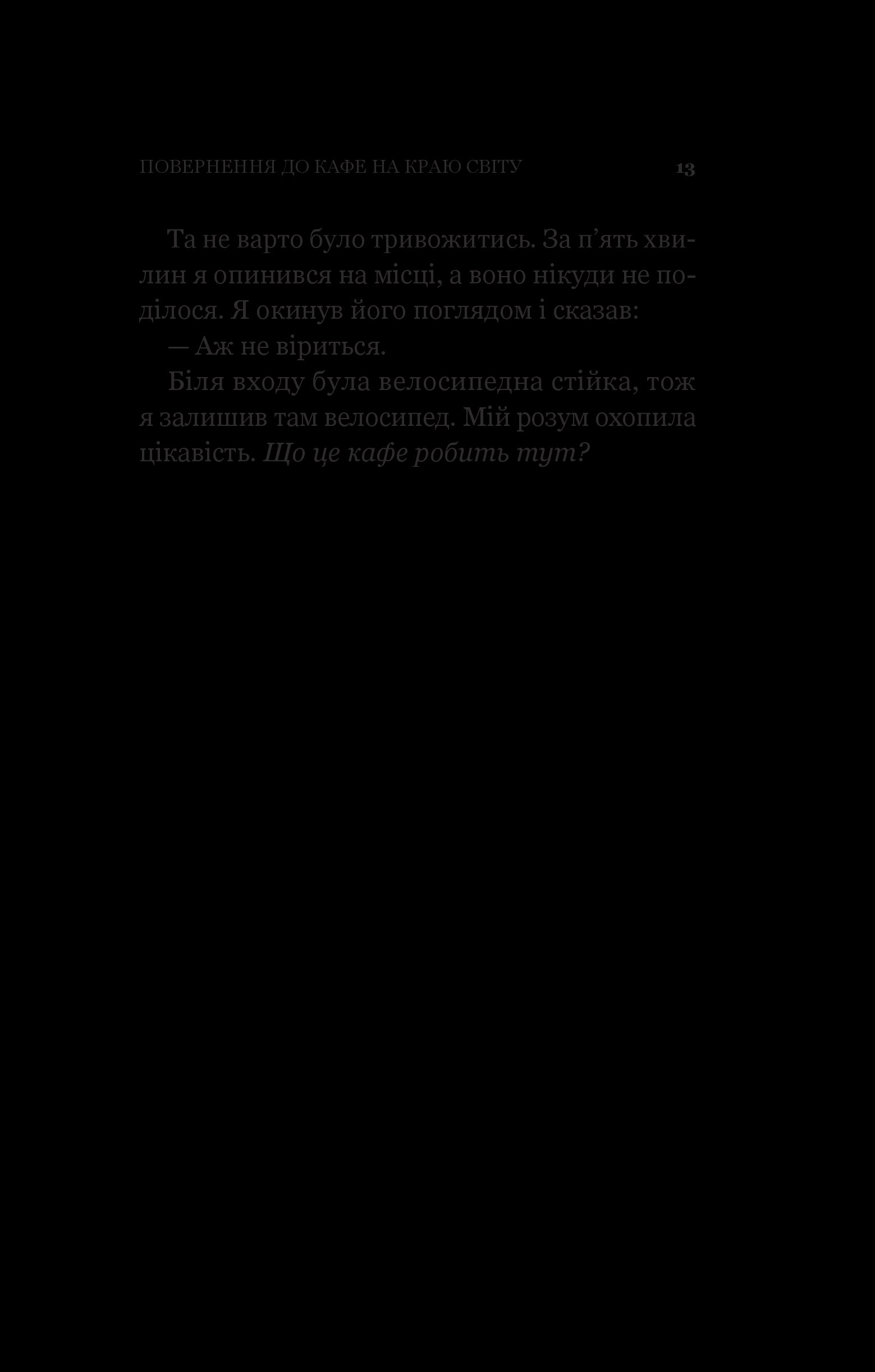 Книга «Повернення до кафе на краю світу» всесвітньо відомого мандрівника та коуча Джона П. Стрелекі є продовженням серії про дивовижний заклад, де відкриваєш меню — і зустрічаєш найглибші та найважливіші питання у житті: «Чому ви тут?», «Чи боїтеся ви смерті?», «Чи вдоволені ви?».