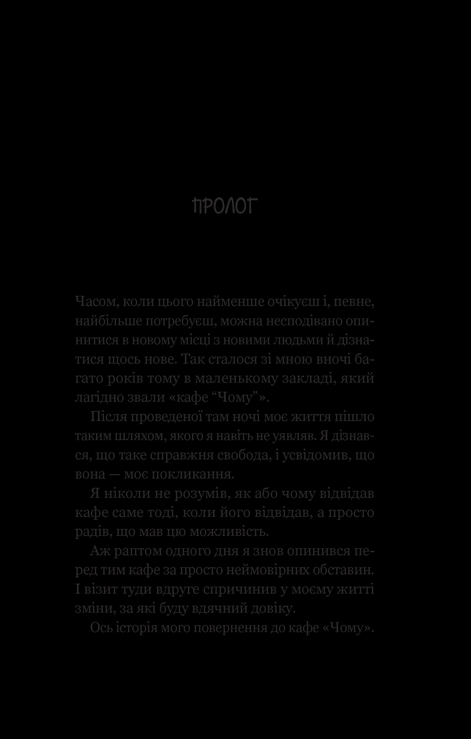 Кафе із дивною назвою «Чому», розташоване на березі океану у віддаленому куточку світу, знову чекає своїх відвідувачів. Його двері відчинені для людей, у яких попереду круті зміни у житті. І якщо ви достатньо відважні для чесного самоаналізу, відкриті до самоусвідомлення та особистісного зростання — ця книга для вас. Книга змінює психологічні установки людей, допомагає позбутися пригніченості, безсилля та байдужості, відчуття втрати орієнтирів та невдоволеності.
