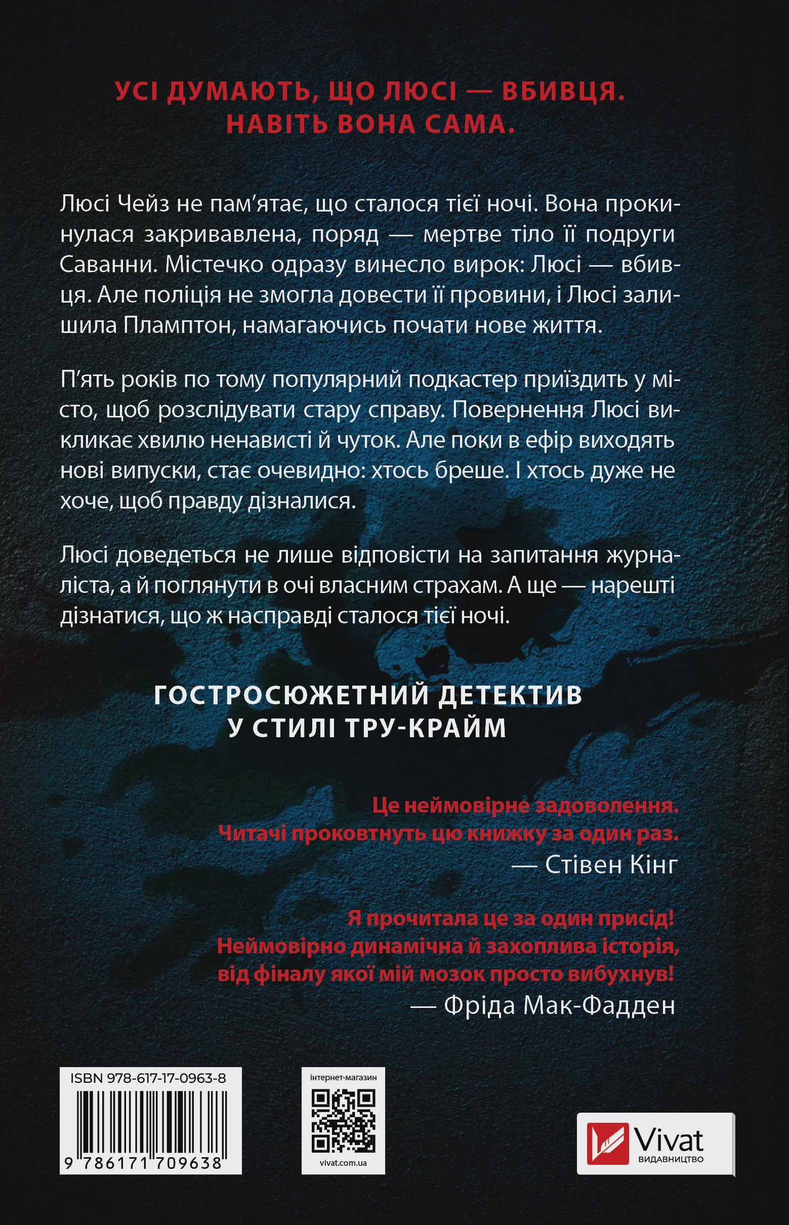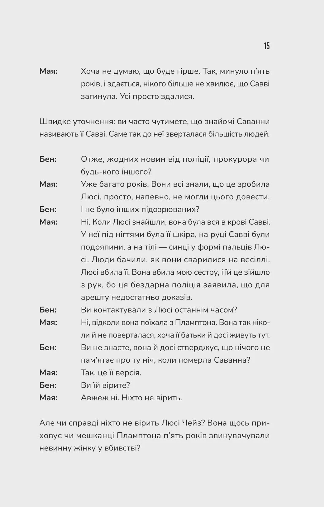 Вже минуло п’ять років, як Люсі Чейз поїхала з Пламптона. Вона не могла залишатися в містечку, де загинула її найкраща подруга Саванна Гарпер. Тієї жахливої ночі Люсі була поруч із Савві, та невідомо, що сталося навсправжки… Гарпер знайшли мертвою, а Чейз — в крові покійниці. Її руки були багряні та липкі, а під нігтями виявили шкіру вбитої… Поліціянти переконували близьких жертви: навіть цих доказів замало, щоб висунути звинувачення проти Люсі, адже сама дівчина нічого не пам’ятає. Утім, настав час розкрити старі секрети та з’ясувати, що ж відбувалося між подругами пів декади тому…