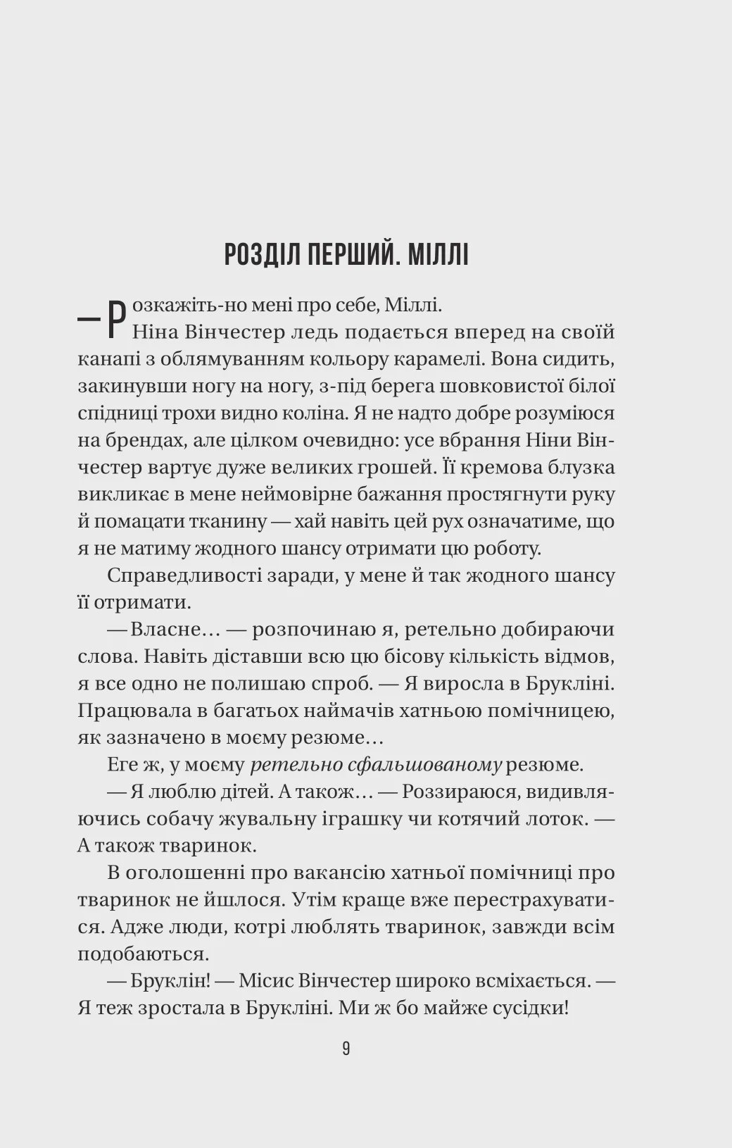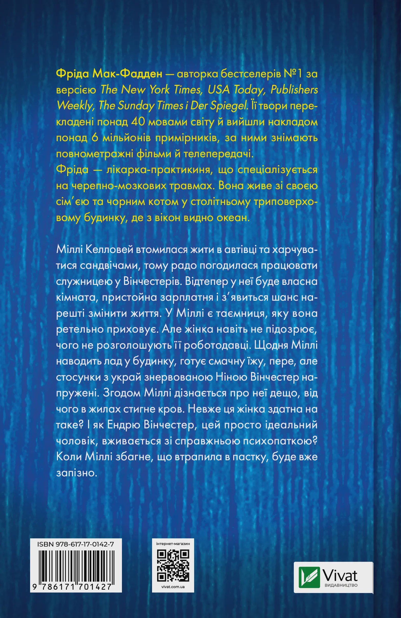 Книга «Служниця» Фріди Мак-Фадден — це насичений та напружений психологічний трилер, здатний холодити нерви та розрахований на шукачів яскравих емоцій, інтелектуальних загадок та карколомних сюжетних поворотів. Американська письменниця майстерно заплутала сюжет у такий спосіб, що за розкриття таємниць читачі беруться із завмиранням серця.