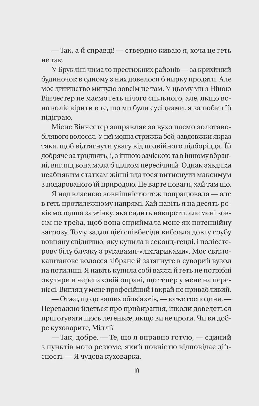 Але постривайте, якщо ви думаєте, що попереду тривіальна історія про роман покоївки та її босса. Все значно жахливіше, адже Міллі дізнається дещо про Ніну Вінчестер. Виявляється, в одному домі зі служницею мешкає небезпечна психопатка, здатна на вчинки, від яких холоне кров! Але коли Міллі розуміє, що опинилася у тенетах справжнього монстра у людській подобі, вже, можливо, занадто пізно… Пастка замкнулася і фатальна гра на виживання почалася.