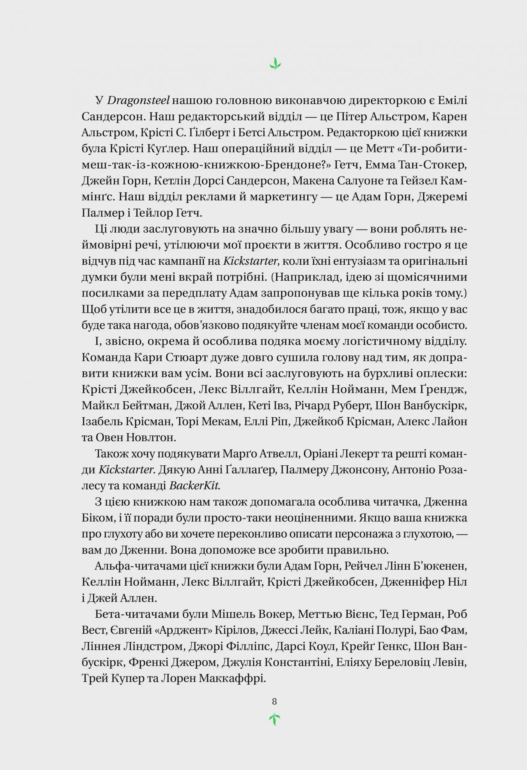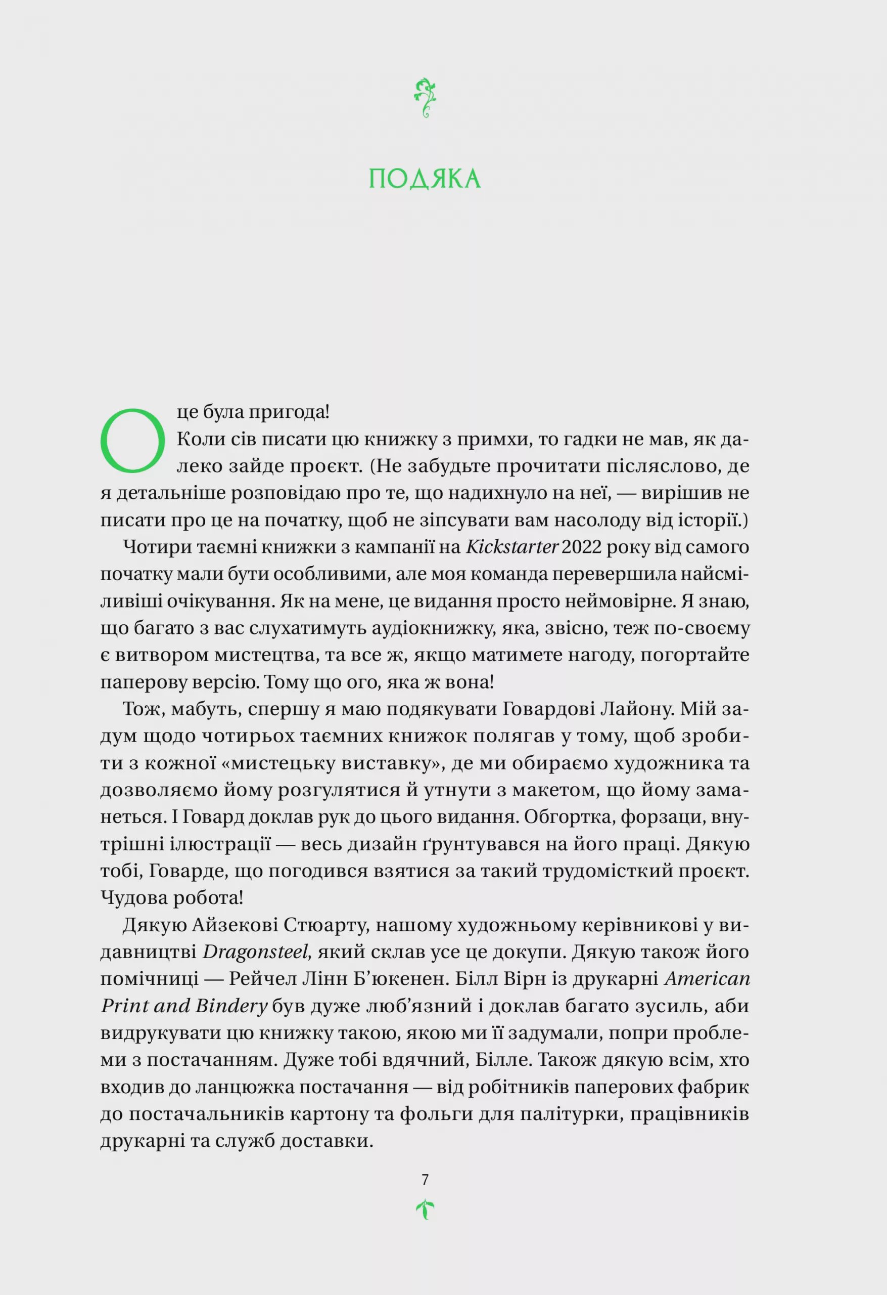 Історію «Тресс зі Смарагдового моря» Брендон Сандерсон розповідає немов казку: химерну, чудернацьку морську пригоду зі всесвіту Космер, що, втім, не потребує читання інших текстів для повного розуміння сюжету. Колоритних персонажів і морських просторів, які долатиме Тресс, сповна розкриває текст, а особливо доповнюють ілюстрації: витончені малюнки Говарда Лайона зроблять цю подорож захопливою у квадраті.