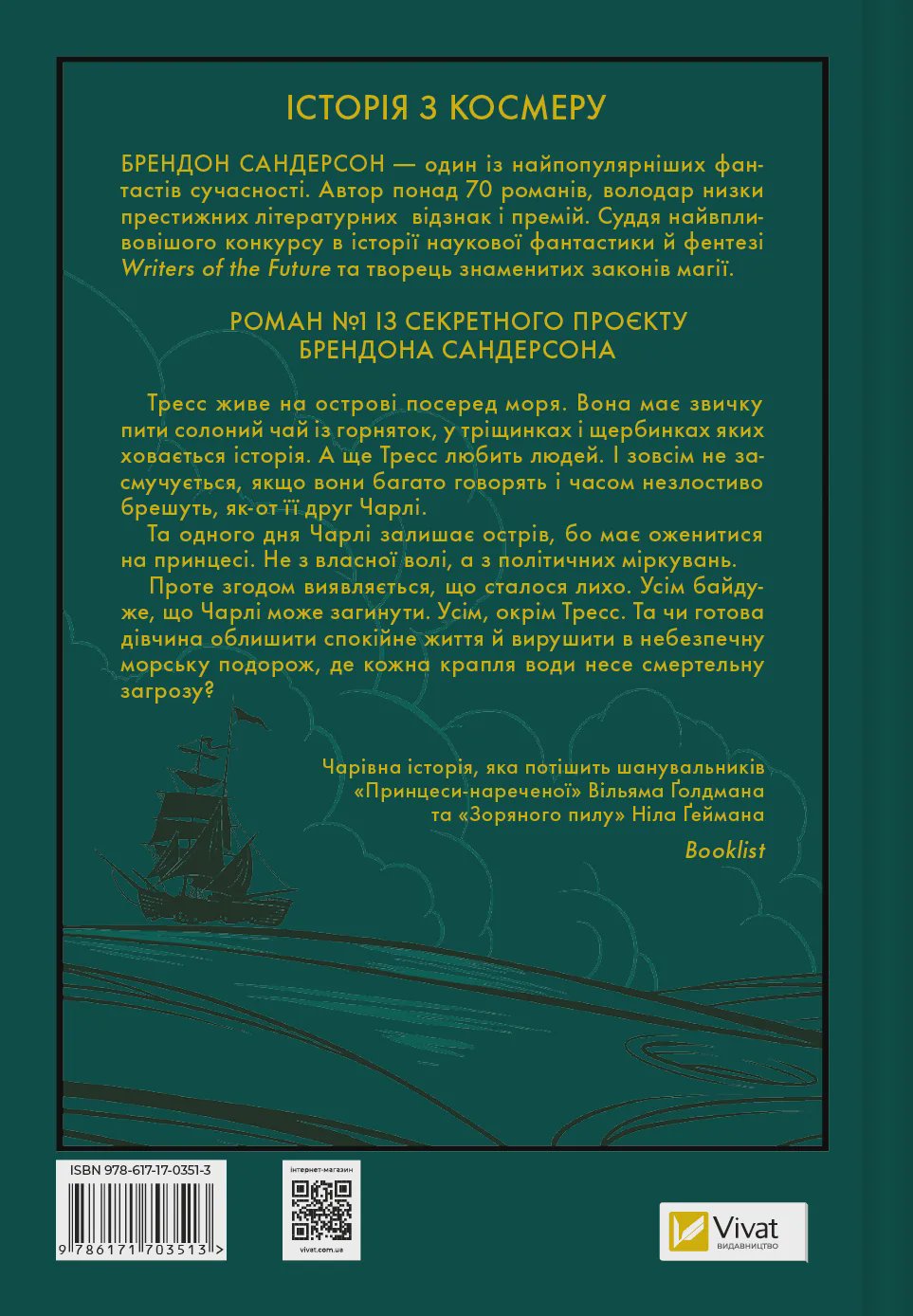 Книга «Тресс зі Смарагдового моря» — це фентезі-пригоди відважної жительки острова Тресс від американського письменника Брендона Сандерсона. Життя дівчини на острові серед смарагдового океану просте: колекціонувати чашки, привезені моряками з далеких країн, пити солоний чай з горняток у тріщинках і слухати історії свого друга, сина герцога Чарлі.