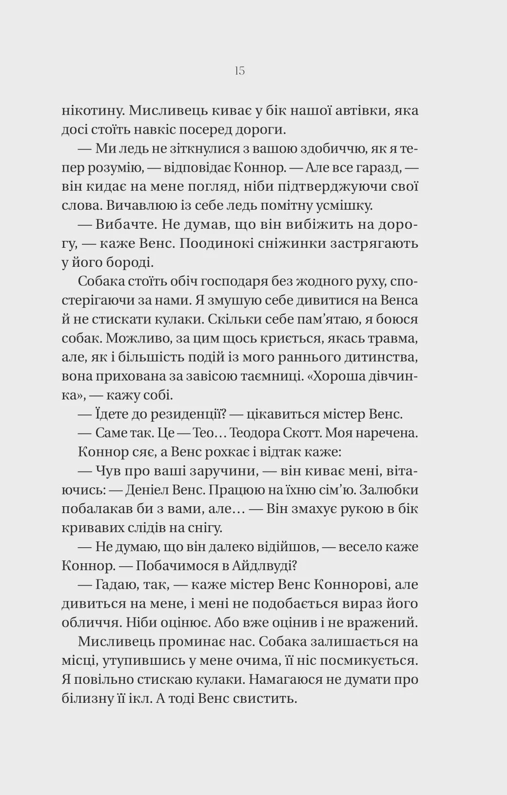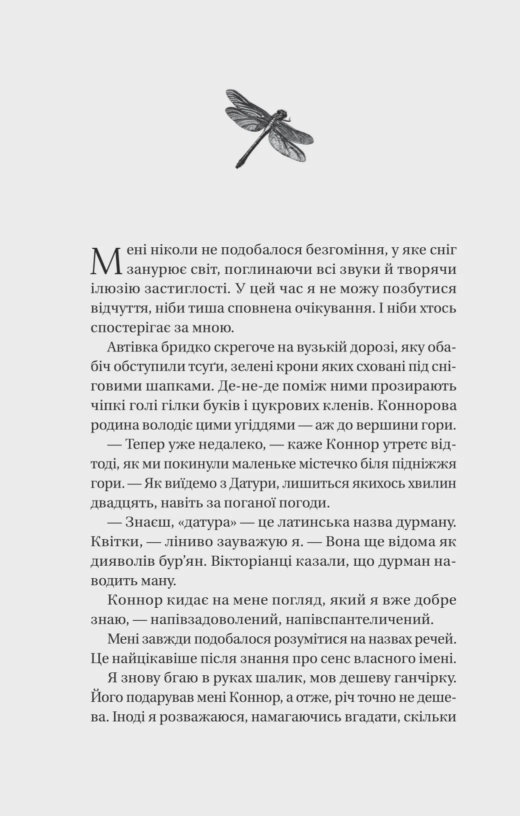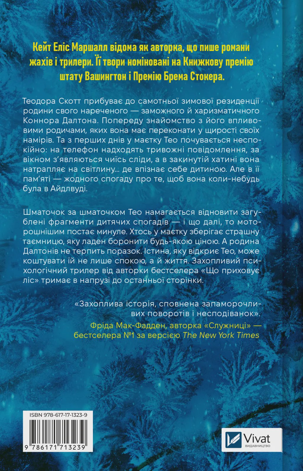 Місце ідеального зимового ретриту наповнює серце Теодори бурхливим неспокоєм, а розум — підозрами. Помешкання викликає нав’язливе дежавю: героїня вже була у цьому будинку — і сімейство Далтонів зберігатиме таємницю її похмурого зв’язку з резиденцією до свого останнього подиху.