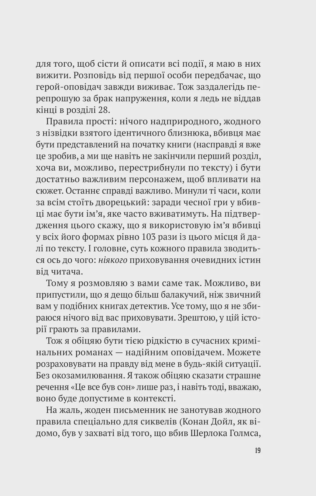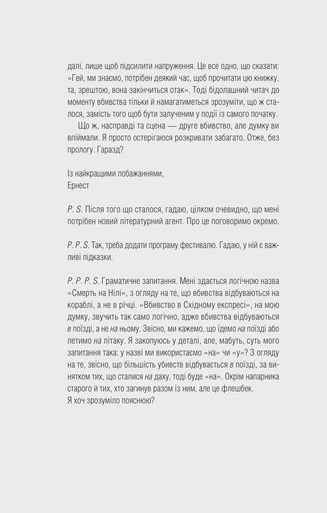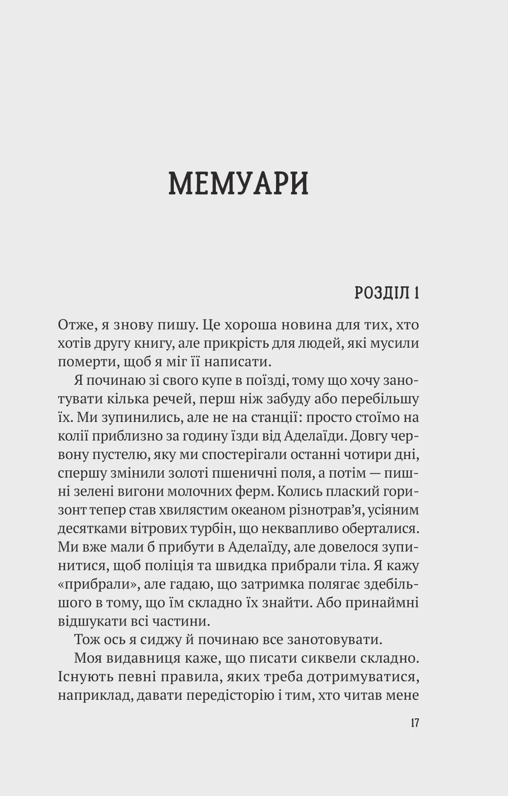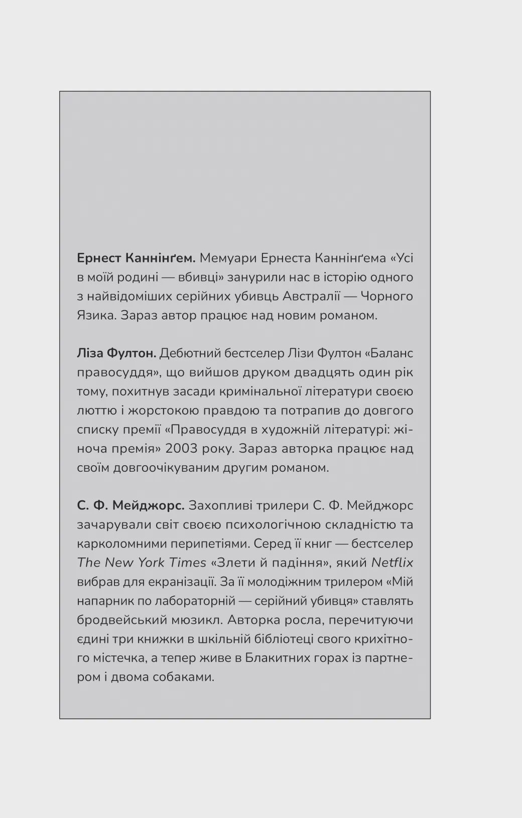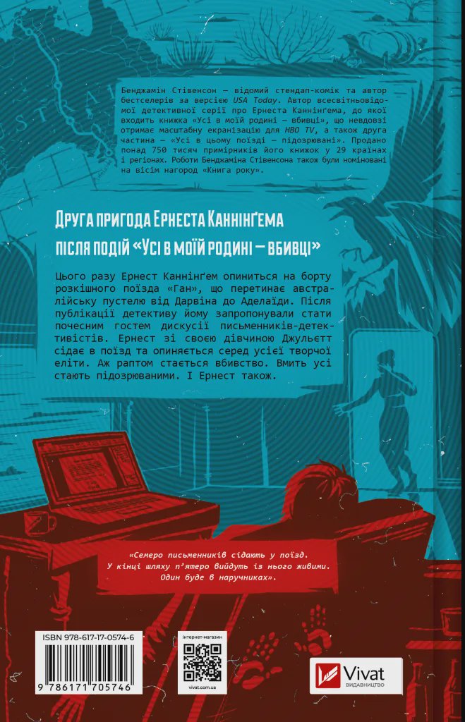 Книга «Усі в цьому поїзді — підозрювані» — це іронічний детектив, автор якого Бенджамін Стівенсон повсякчас ламає «четверту стіну» та кидає виклик усім сюжетним кліше. Дебютний роман Ернеста Каннінґема «Усі в моїй родині — вбивці» був настільки вдалим, що письменника запросили взяти участь в Австралійському фестивалі майстрів жанру.