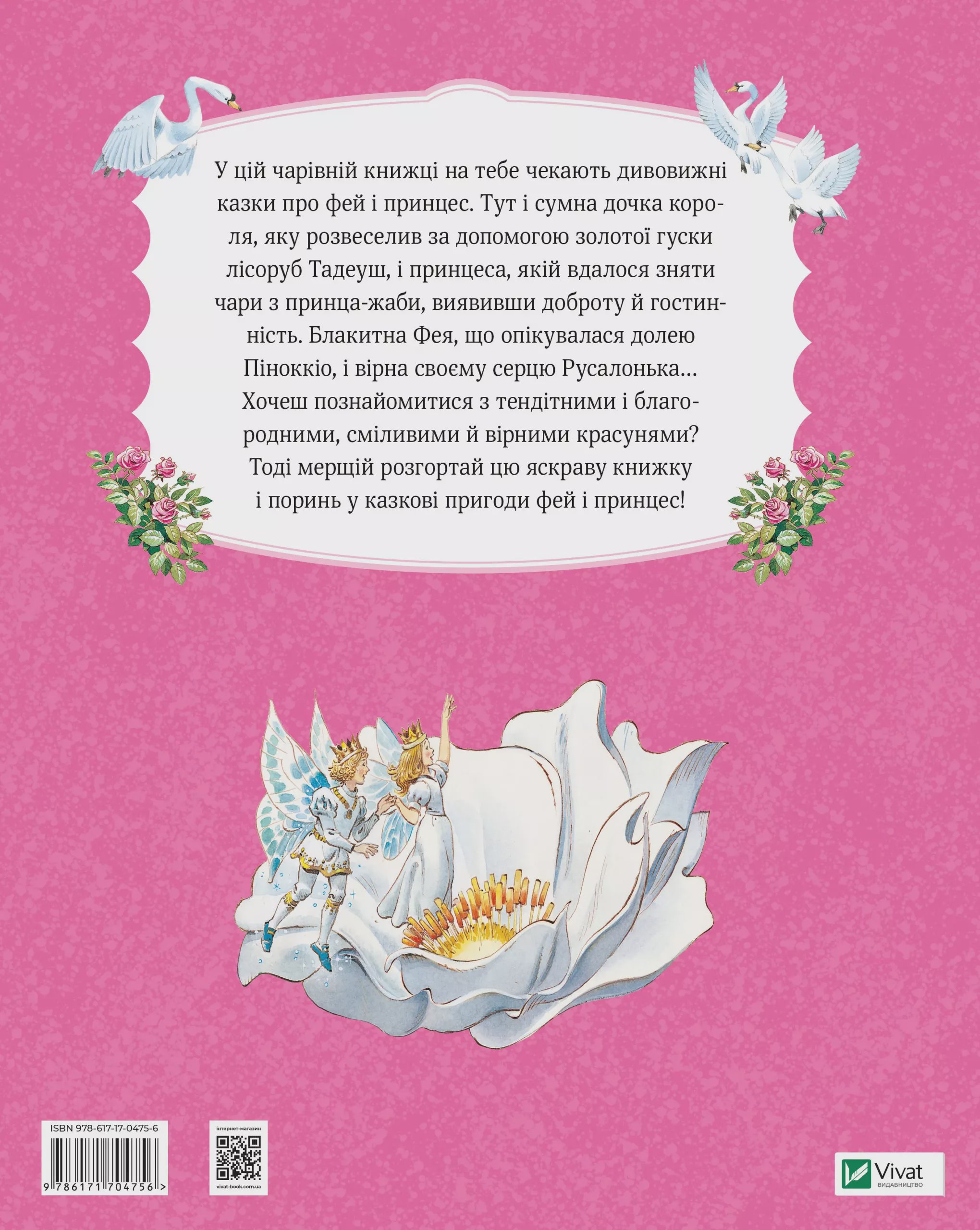 У цій чарівній книжці на тебе чекають дивовижні казки про фей і принцес. Тут і сумна дочка короля, яку розвеселив за допомогою золотої гуски лісоруб Тадеуш, і принцеса, якій вдалося зняти чари з принца-жаби, виявивши доброту й гостинність. Блакитна Фея, що опікувалася долею Піноккіо, і вірна своєму серцю Русалонька… Хочеш познайомитися з тендітними і благородними, сміливими й вірними красунями? Тоді мерщій розгортай цю яскраву книжку і поринь у казкові пригоди фей і принцес!