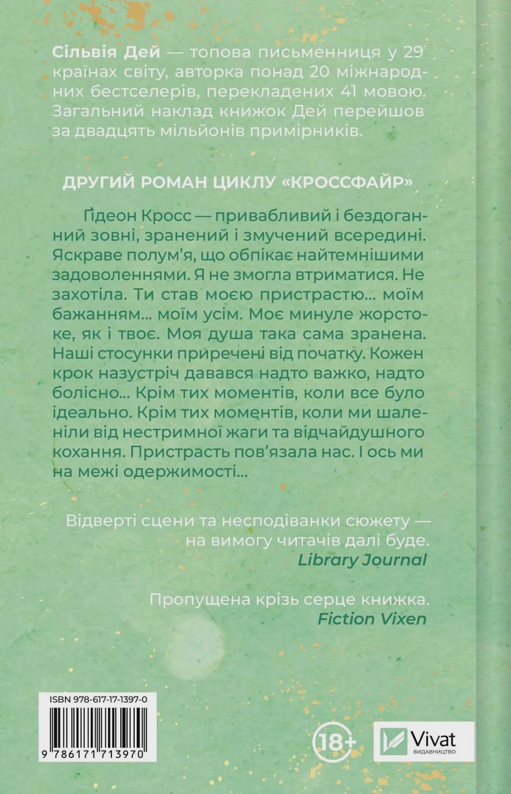 Книга «Відображена в тобі» — це продовження історії кохання двох змучених душ з травматичним минулим від американської письменниці Сільвії Дей. Бурхливі взаємини Єви Тремелл і Ґідеона Кросса набирають обертів. Химерне і палке бажання спонукає їх протистояти власним демонам і працювати над стосунками. Та ці двоє мають надто багато психологічних ран, у яких бояться відкритись партнеру й натомість завдають болю одне одному.