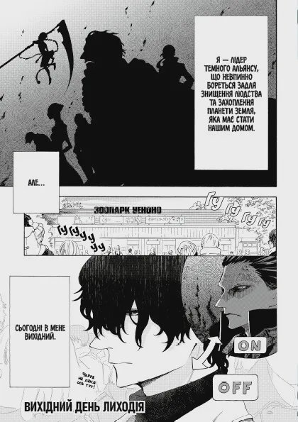 Манґа «Вихідний день Лиходія. Том 1» — це комедія про повсякденність лідера Темного альянсу, що готується до знищення людства. Манґака Ю Морікава з гумором розповідає, як загадковий прибулець намагається знайти баланс між роботою і життям та займається абсолютно буденними справами у перервах між плануванням захоплення Землі. Відтак у центрі сюжету постає «антигерой» з добрим серцем, який щовихідних уникає своїх колег та оголошує перемир’я запеклим ворогам — Рейнджерам.