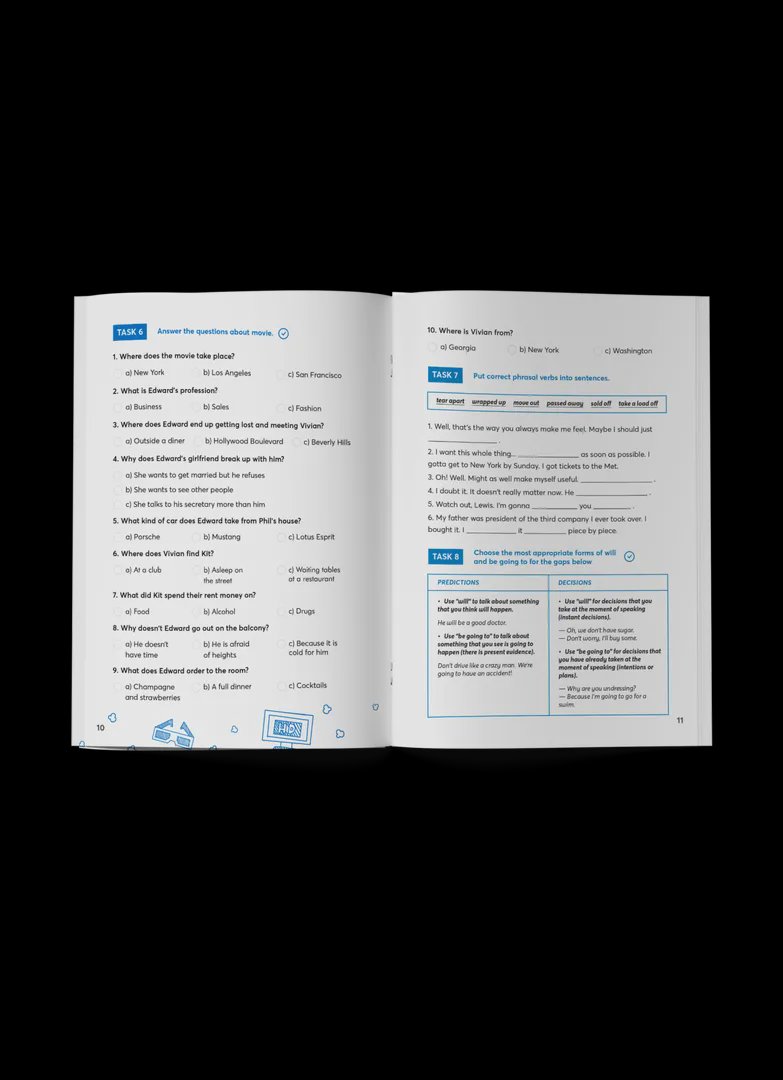 - наступний етап - 20 вправ для засвоєння нової лексики, відпрацювання навичок читання та аудіювання, а також граматики;