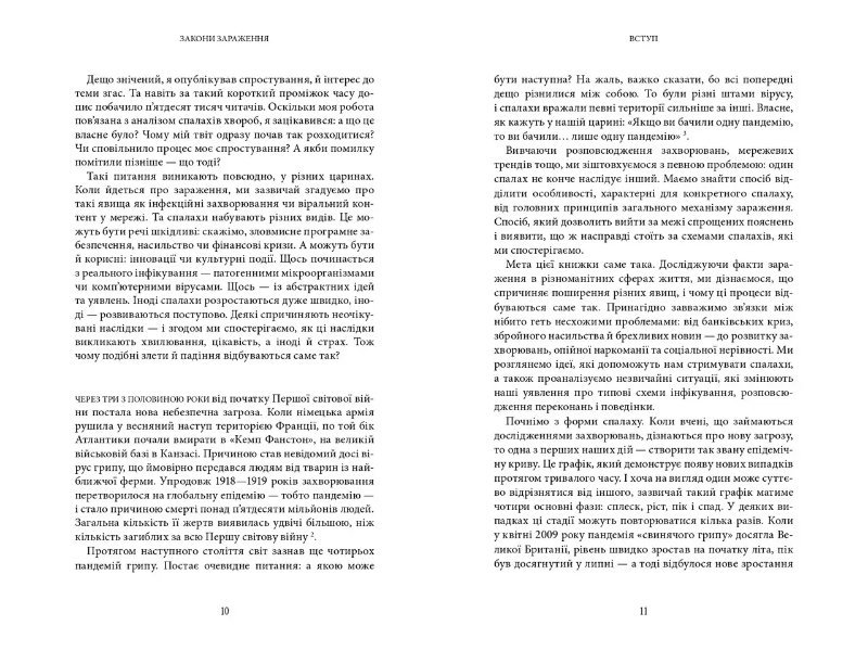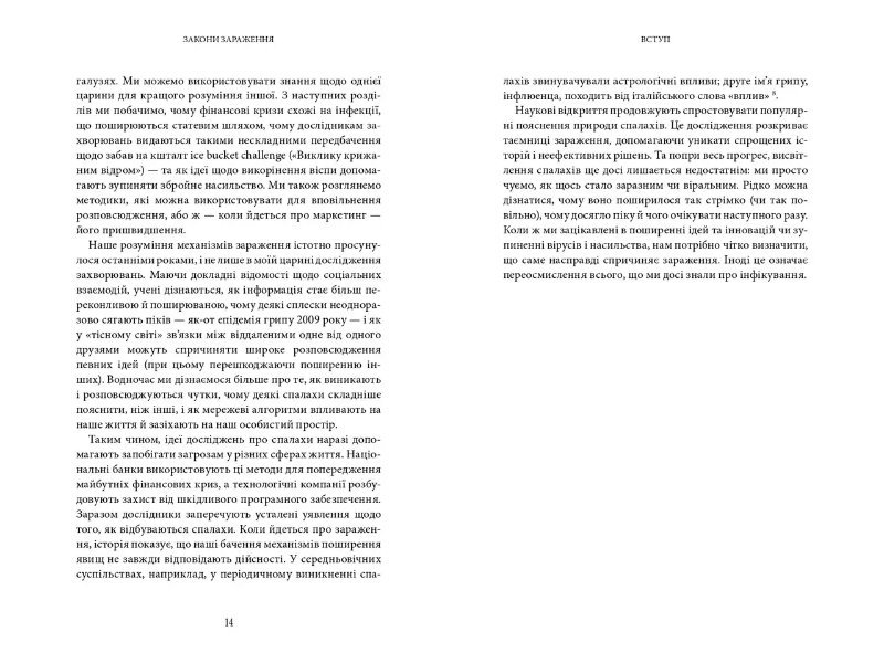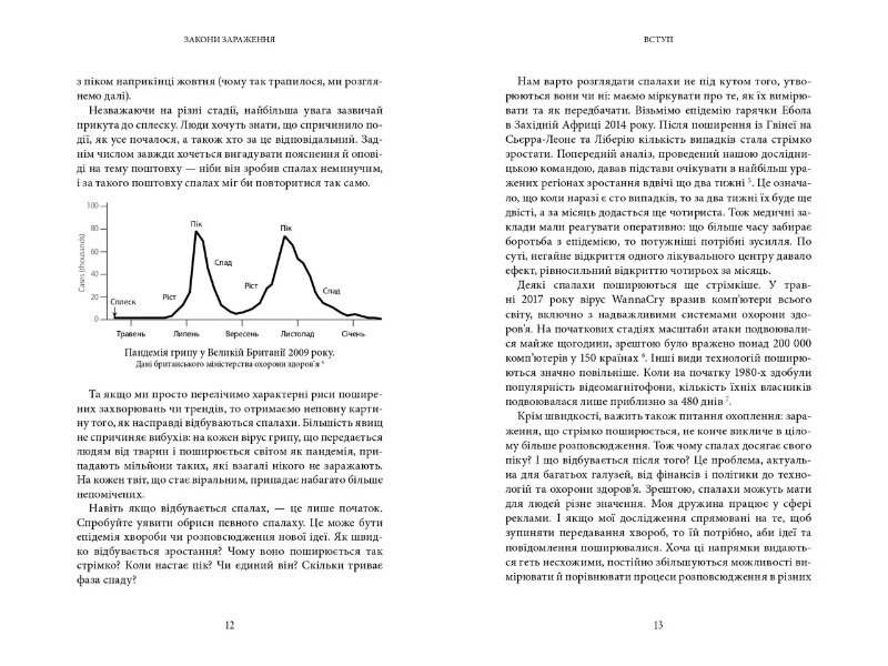 Книга професора Лондонської школи гігієни й тропічних хвороб Адама Кухарського пояснює причини та принципи, які лежать в основі будь-якого зараження: від інфекційних захворювань, комп’ютерних вірусів, дезінформації та фейків до фінансових криз чи спалахів збройного насильства. Спираючись на математичні моделі й підсилюючи аналіз ситуацій неабиякою ерудицією, автор описує численні випадки заражень у минулому, пропонуючи відповідь, що слід робити, аби уникнути заражень у майбутньому.
