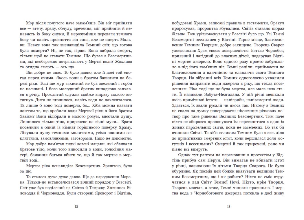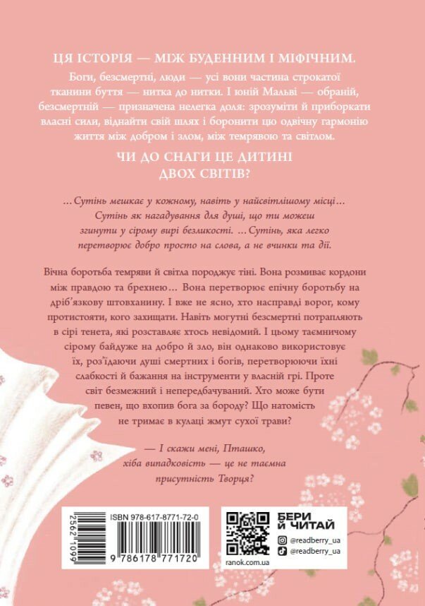 Ця історія — між буденним і міфічним. Боги, безсмертні, люди — усі вони частина строкатої тканини буття — нитка до нитки. І юній Мальві — обраній, безсмертній — призначена нелегка доля: зрозуміти й приборкати власні сили, віднайти свій шлях і боронити цю одвічну гармонію життя між добром і злом, між темрявою та світлом. Чи до снаги це дитині двох світів?